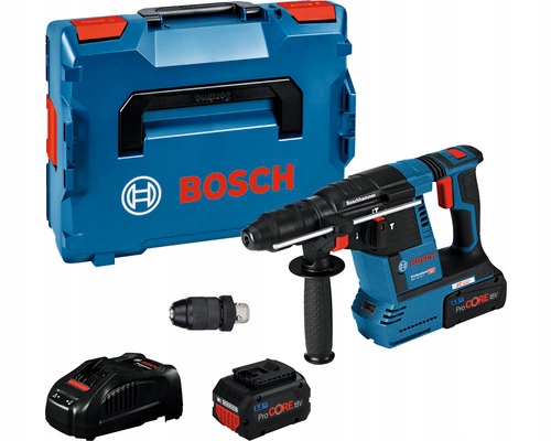 GBH 18V-26 F, 2 x akumulator ProCORE18V 5,5Ah, szybka ładowarka GAL 1880 CV, wymienny uchwyt SDS plus, L-BOXX, dodatkowy uchwyt, ogranicznik głębokości 210 mm, szybkowymienny uchwyt wiertarski 13 mm