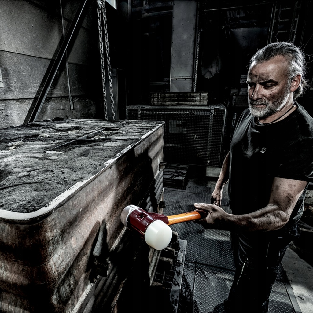 - Młotek SIMPLEX z kombinacją końcówek z nylonu (biały, twardy, bardzo odporny na ścieranie, nie odpryskuje nawet w temperaturach poniżej zera, odporny na oleje i smary) i z miękkiego metalu (srebrny, twardy, odporny na wysokie temperatury).