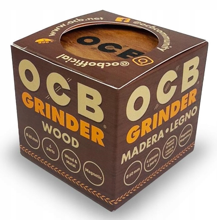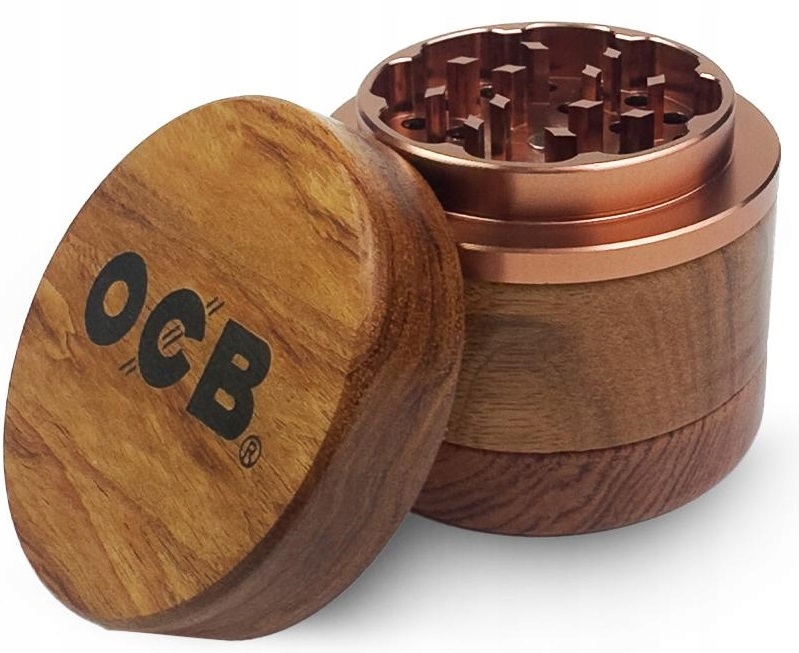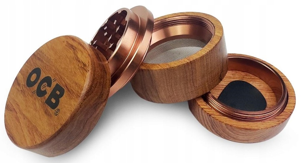 Młynek OCB Grinder z magnetycznym wieczkiem wykonany z aluminium z imitacją drewna.Obudowa poprawiająca chwyt podczas użytkowania.Składa się z czterech elementów: wieczko, młynek, sitko i zbiornik.Średnica: 6 cm.