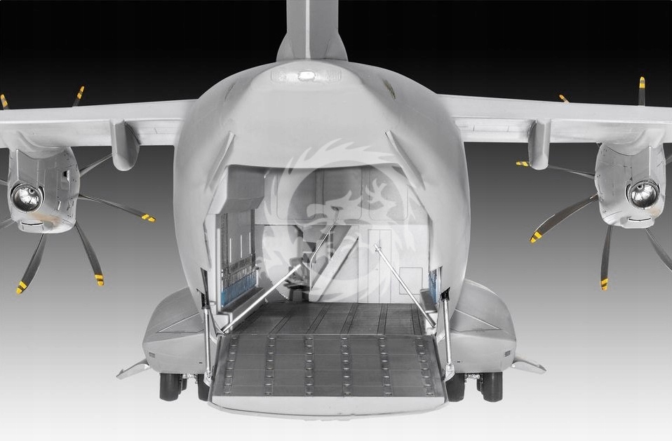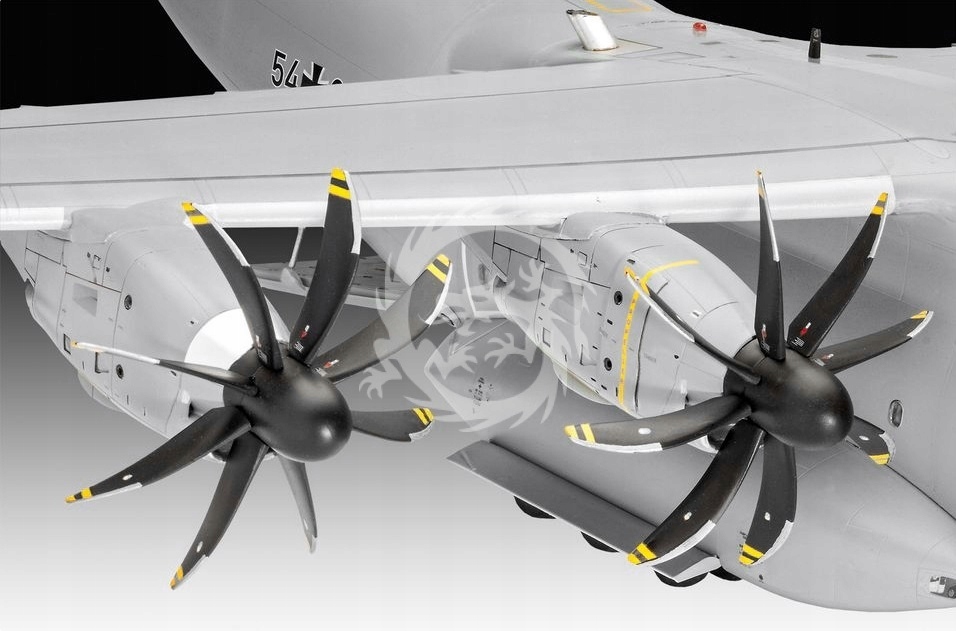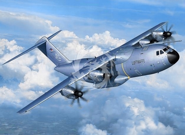 Model plastikowy niemieckiego samolotu transportowego Airbus A400M "Atlas" "Luftwaffe", Revell, skala 1/72. Zestaw zawiera: dwanaście wyprasek z częściami modelu; arkusz kalkomanii; instrukcja, 212 części, skala 1/72.