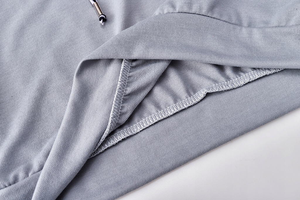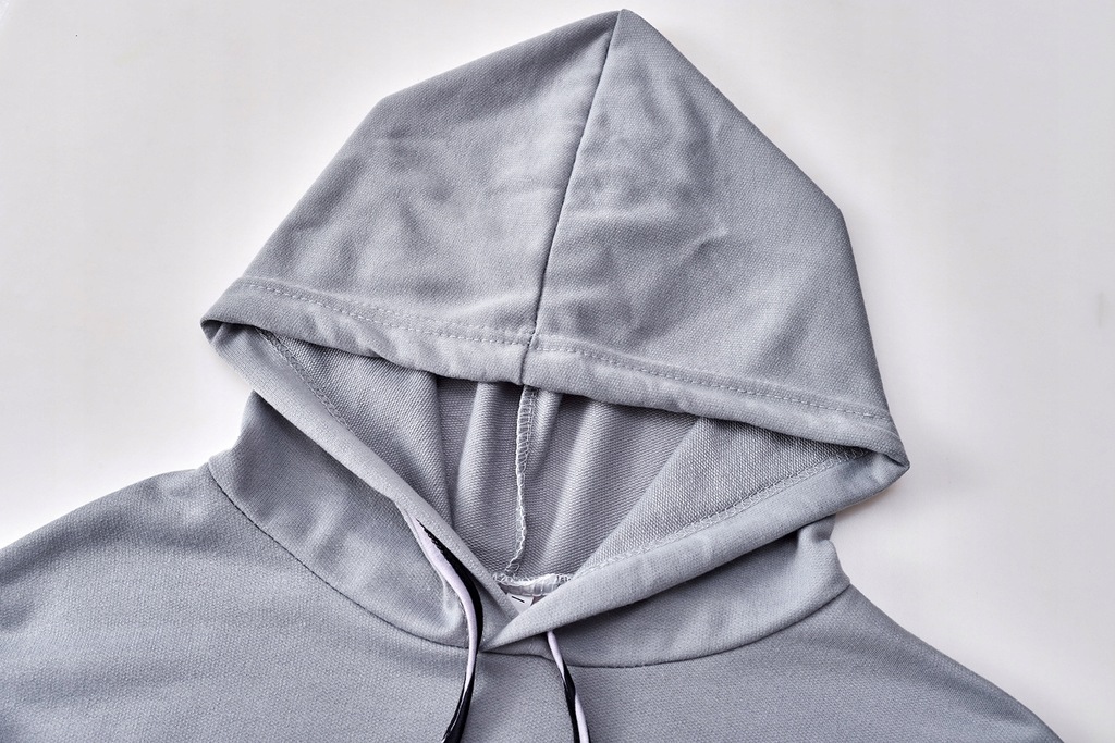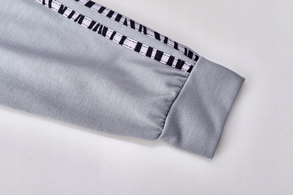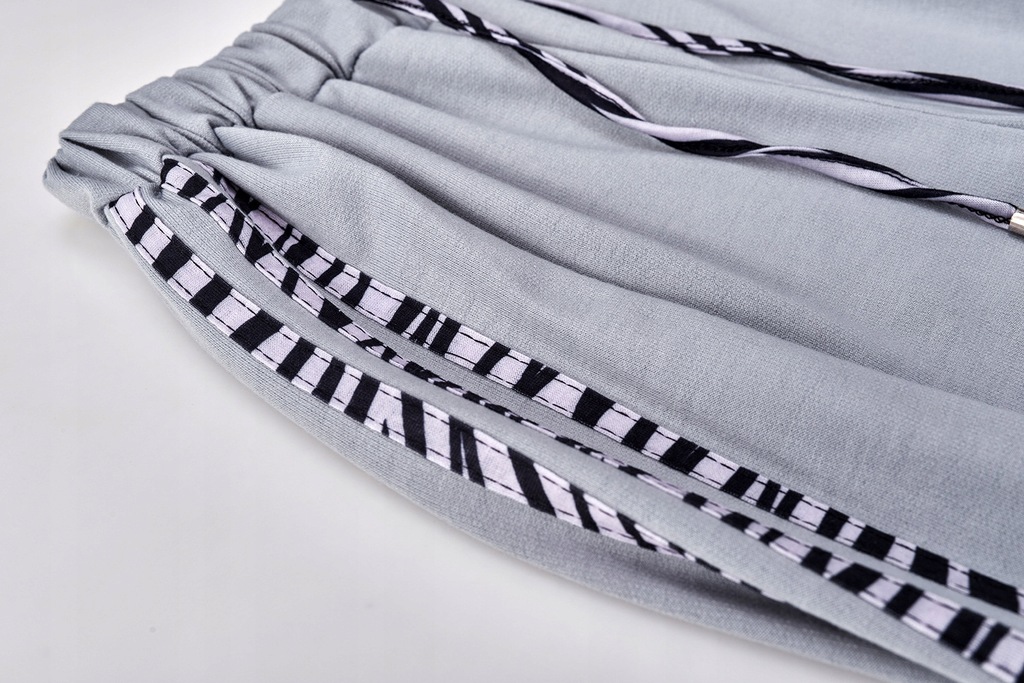 Komplet odzieży sportowej składający się z bluzy z kapturem i zwężanych spodni. Posiada pasek z ciekawym wzorem, dzięki czemu tworzy spójną całość.