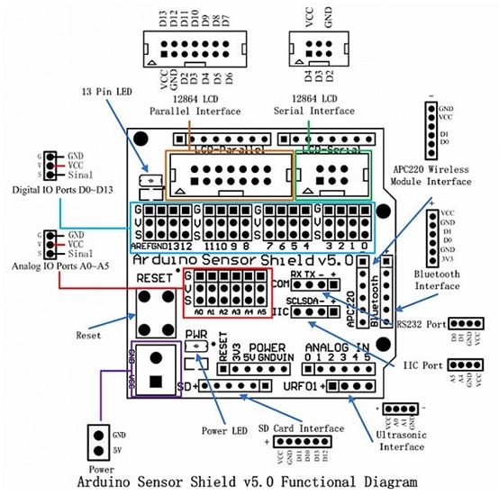 Moduł AVR Sensor Shield V5 umożliwia podłączenie plug and play różnych modułów takich jak czujniki, servo, przekaźniki, potencjometry itd. Różnego rodzaju złącza pozwalają na szybkie i pewne połączenie czujników, przewodów, taśm i innych.