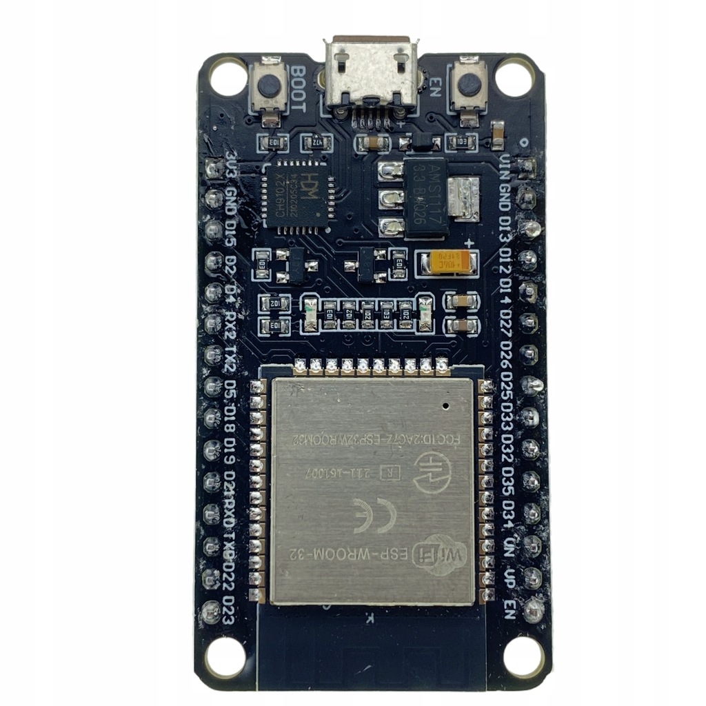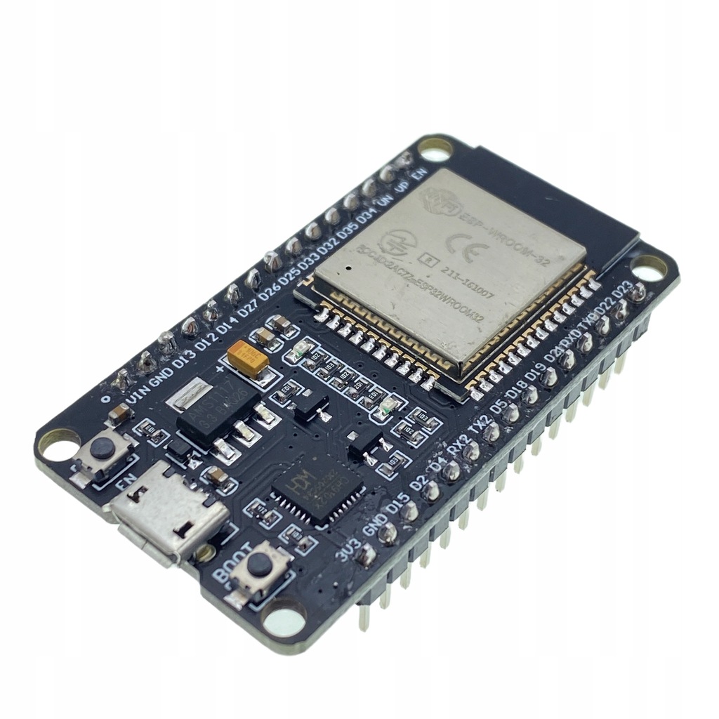 Płytka ESP-32 z wbudowanym modułem ESP-WROOM-32. Układ z rodziny ESP32 umożliwia komunikację poprzez sieć WiFi w paśmie 2,4 GHz oraz w standardzie Bluetooth v 4.2. Układ posiada 30 wyprowadzeń wraz z popularnymi interfejsami, m.in: UART, SPI, I2C.