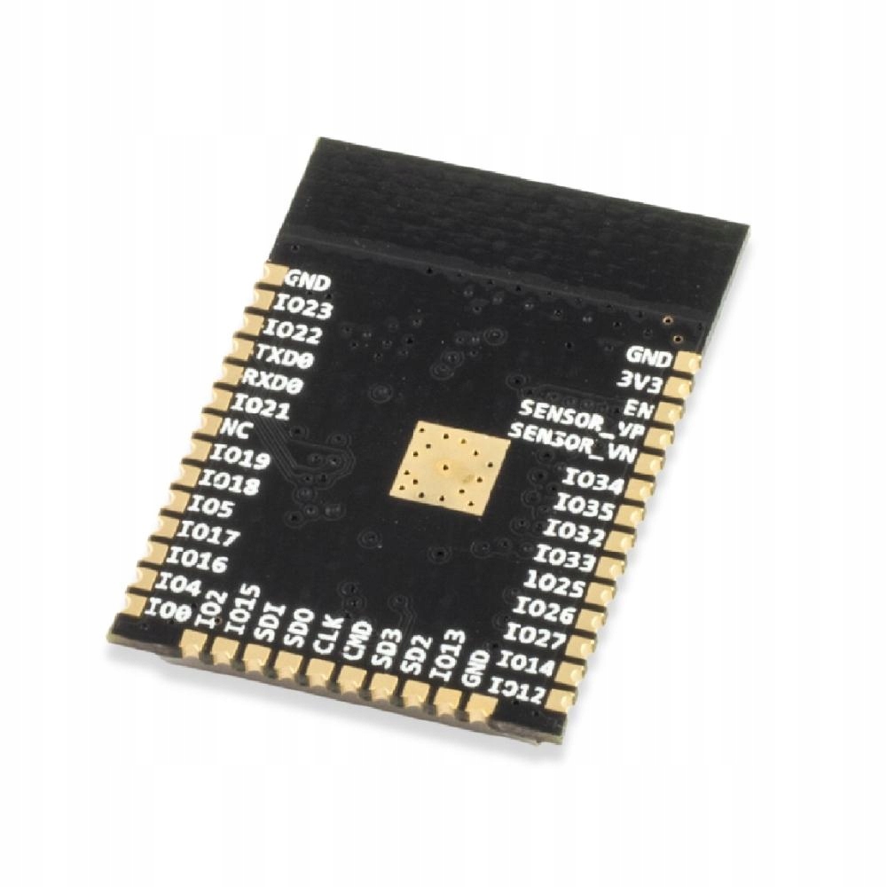 ESP32 to potężny 32-bitowy mikrokontroler. Na krawędzi modułu zostały wyprowadzone najważniejsze piny mikrokontrolera. Dostępne jest GPIO, I2C, UART, SPI, ADC, PWM, SDIO.