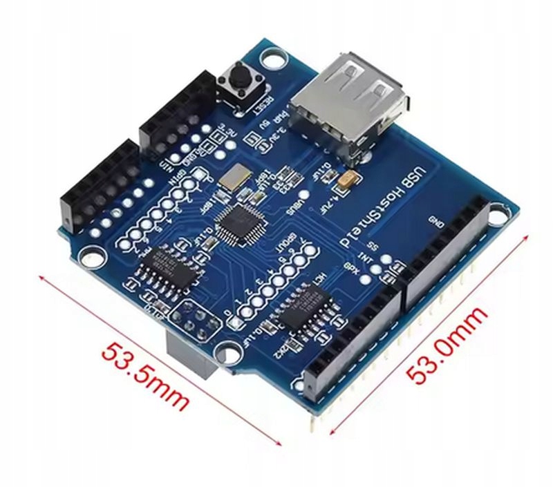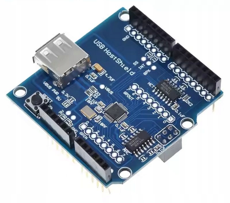Moduł rozszerzeń USB HOST SHIELD umożliwia podłączenie urządzeń USB do płytki mikrokontrolera typu Arduino UNO R3 i innych.
