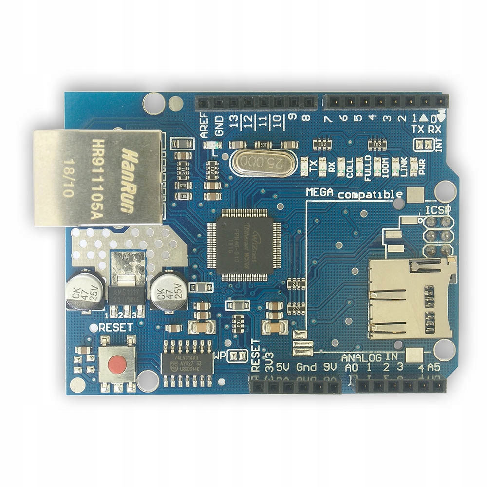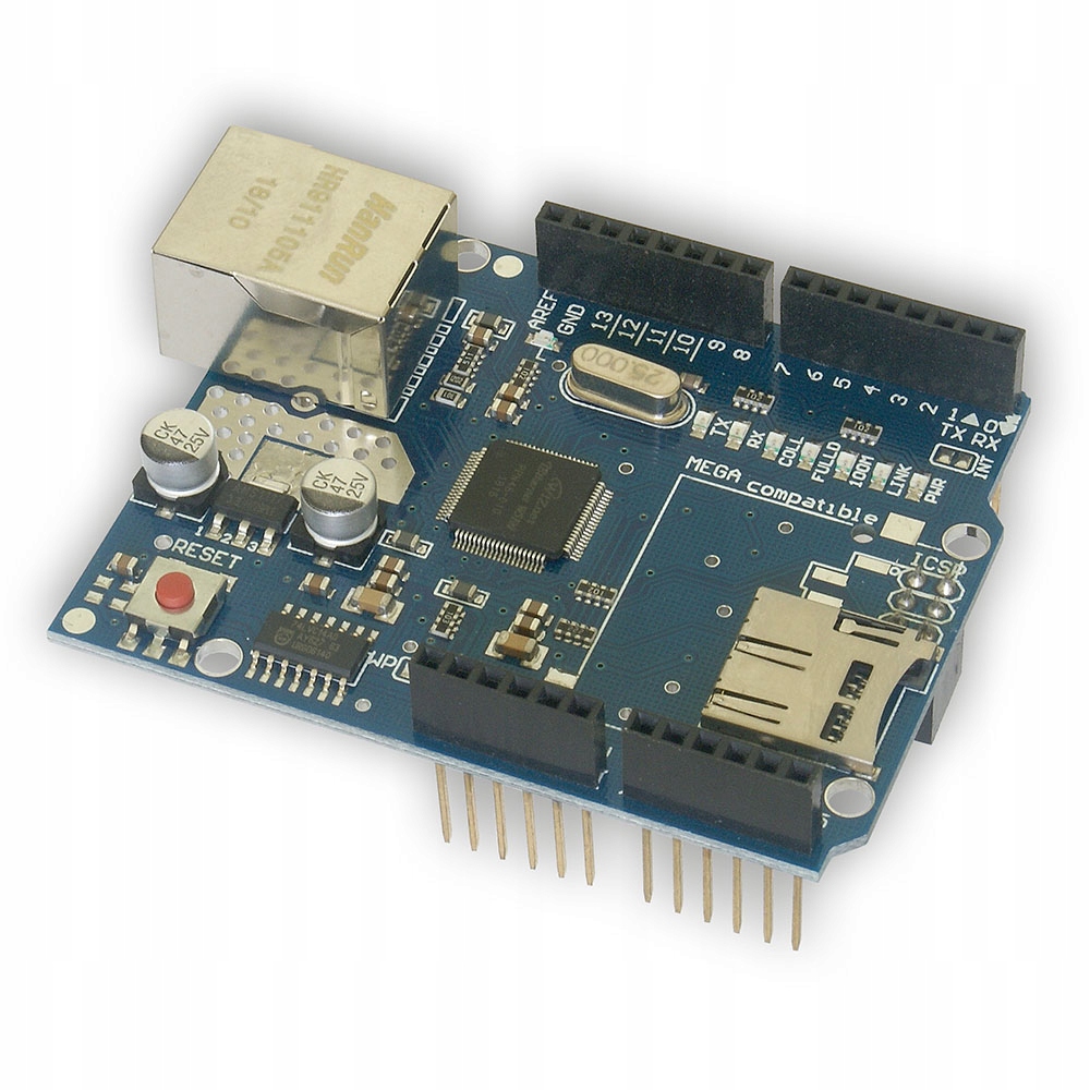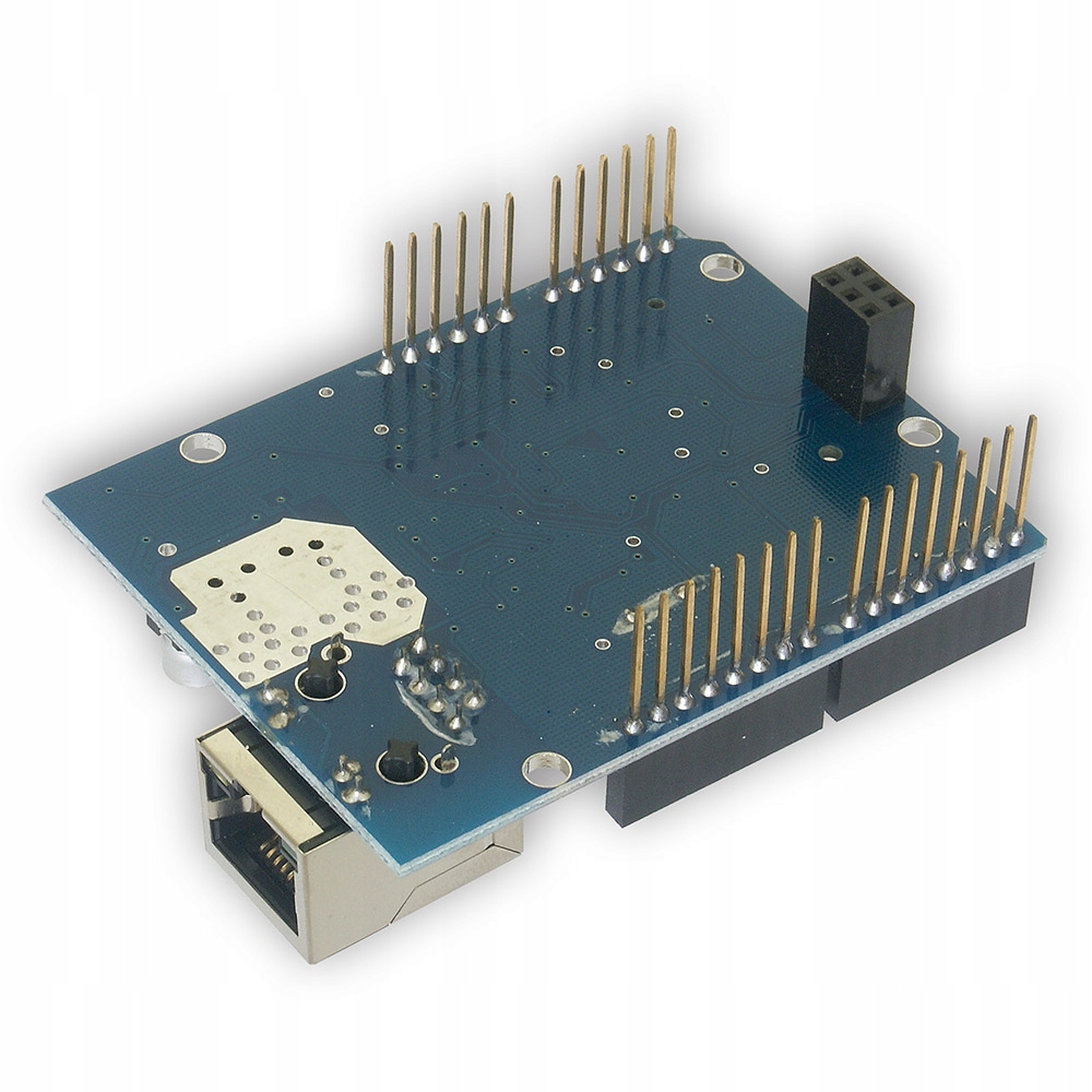 Moduł oparty na układzie W5100 umożliwiający użytkownikom Arduino w prosty sposób połączyć się z siecią Ethernet. Układ Wiznet W5100 obsługuje zarówno protokuł TCP jak i UDP, i umożliwia jednocześnie do 4 połączeń. Współpracuje z Arduino Uno, Mega 2560 oraz Leonardo. Posiada także czytnik kart pamięci microSD.