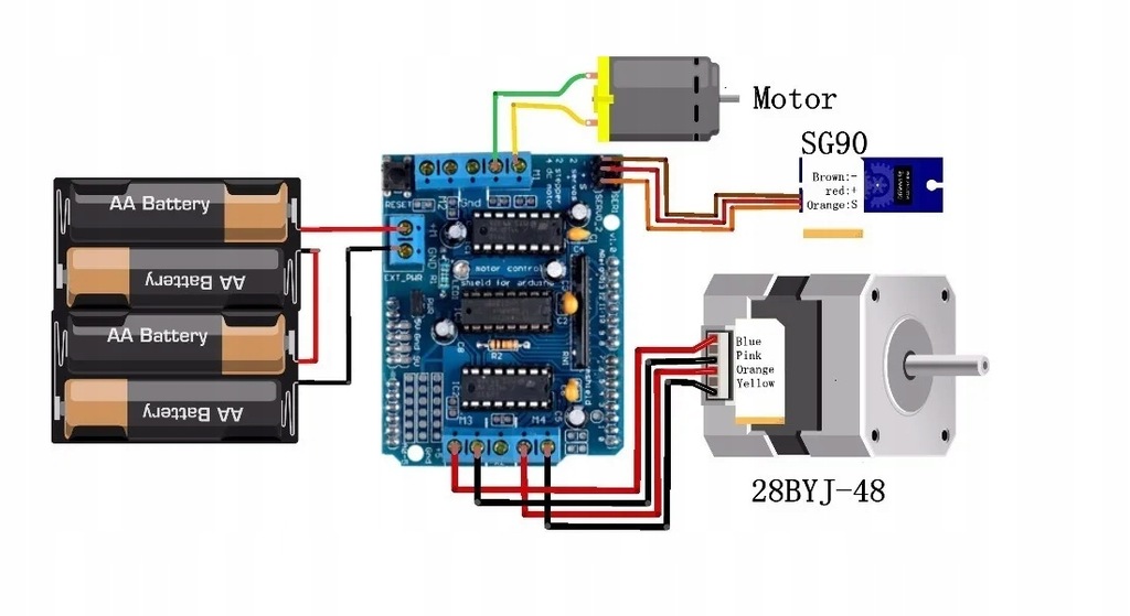 - Mostki H L293D zapewniające sterowanie prądem do 0,6 A (chwilowo do 1,2 A)