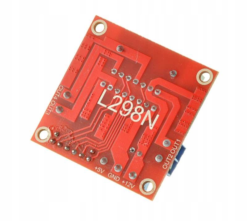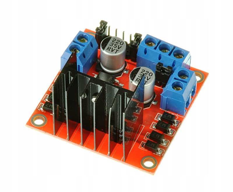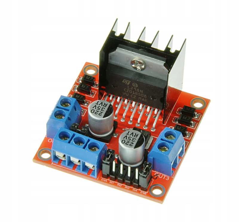 L298N to sterownik silników dużej mocy. Umożliwia kontrolę kierunku obrotów i prędkości dwóch silników prądu stałego lub jednego dwu fazowego silnika krokowego. Układem można sterować przy pomocy Arduino podpinając jego goldpiny pod wejścia układu: IN1, IN2, IN3, IN4 a także zasilając logikę układu napięciem 5V. Większe napięcie (do 12V) należy podpiąć osobno pod piny 12V i masę pod GND. Duża wydajność prądowa wynosząca 2A na jeden kanał daje możliwość zastosowania większych silników. L298N zawiera zabezpieczenie przed przegrzaniem układu. Dzięki złączom śrubowym ARK zasilanie, oraz same silniki można w prosty sposób podłączyć przykręcając przewody przy pomocy wkrętaka. Układ posiada zamontowany radiator.