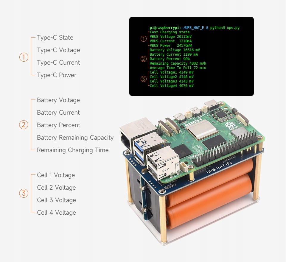 ⭐UPS HAT (E) to zaawansowana płytka rozszerzeń do zasilania awaryjnego dedykowana dla serii Raspberry Pi, zapewniająca stabilne zasilanie o mocy 5V i prądzie 6A. Dzięki dwukierunkowemu portowi Type-C, moduł wspiera szybkie ładowanie z mocą do 40W, umożliwiając jednoczesne zasilanie urządzenia i ładowanie podłączonych baterii. Dzięki zintegrowanym wskaźnikom stanu baterii oraz funkcji monitorowania przez magistralę I2C, UPS HAT (E) pozwala na bieżąco kontrolować stan napięcia, prądu, mocy oraz pozostałej pojemności akumulatora.