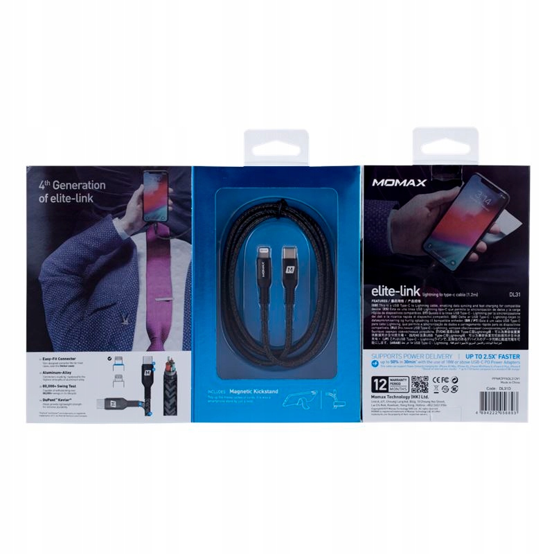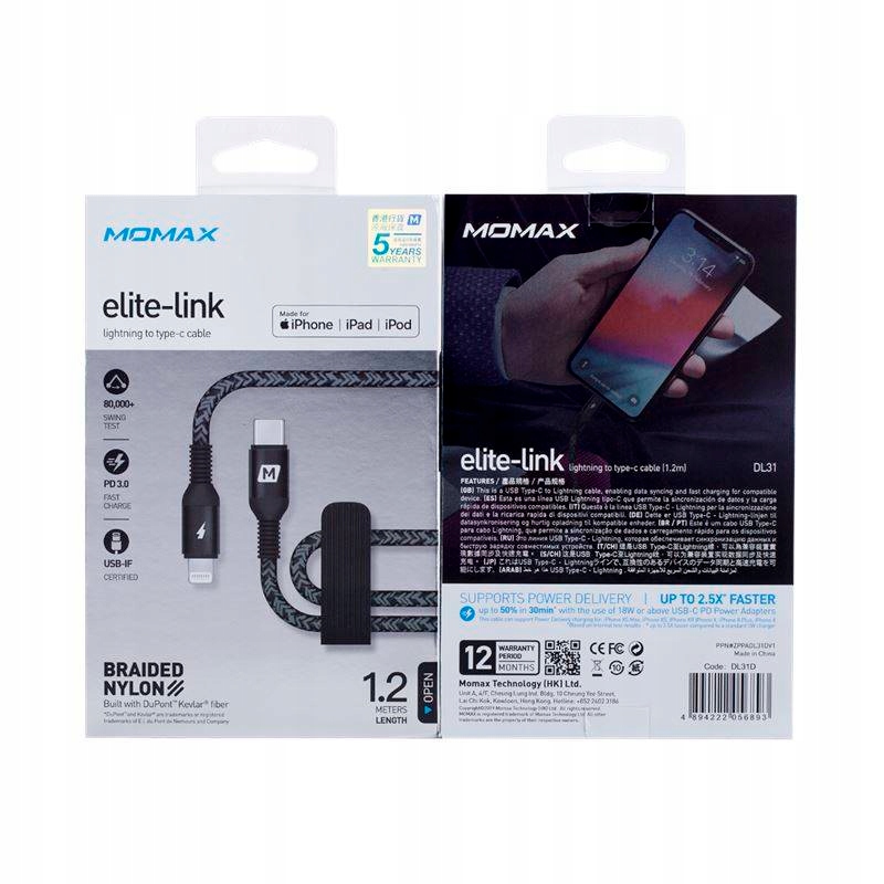 Nowej generacji przewód USB-C do Lightning z serii MOMAX Elite Link w nylonowym oplocie o długości 1,2 m (wzmacniany włóknami aramidowymi). Technologia PD 3.0 zapewnia szybkie ładowanie w iPhonie lub iPadzie Pro przy użyciu nowoczesnych ładowarek USB-C 18W lub więcej z funkcją Power Delivery (do 2.5x szybciej w porównaniu do standardowych ładowarek 5W). Certyfikat MFi dla urządzeń Apple gwarantuje też 100% zgodności z najnowszymi wersjami systemu iOS i poprawne funkcjonowanie baterii.