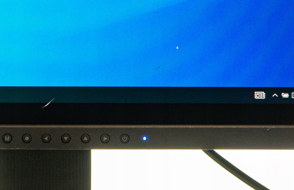 Monitor posiada 2 rysy na matrycy widoczne na zdjęciu po lewej, nie są one szczególnie dokuczliwe podczas pracy.
