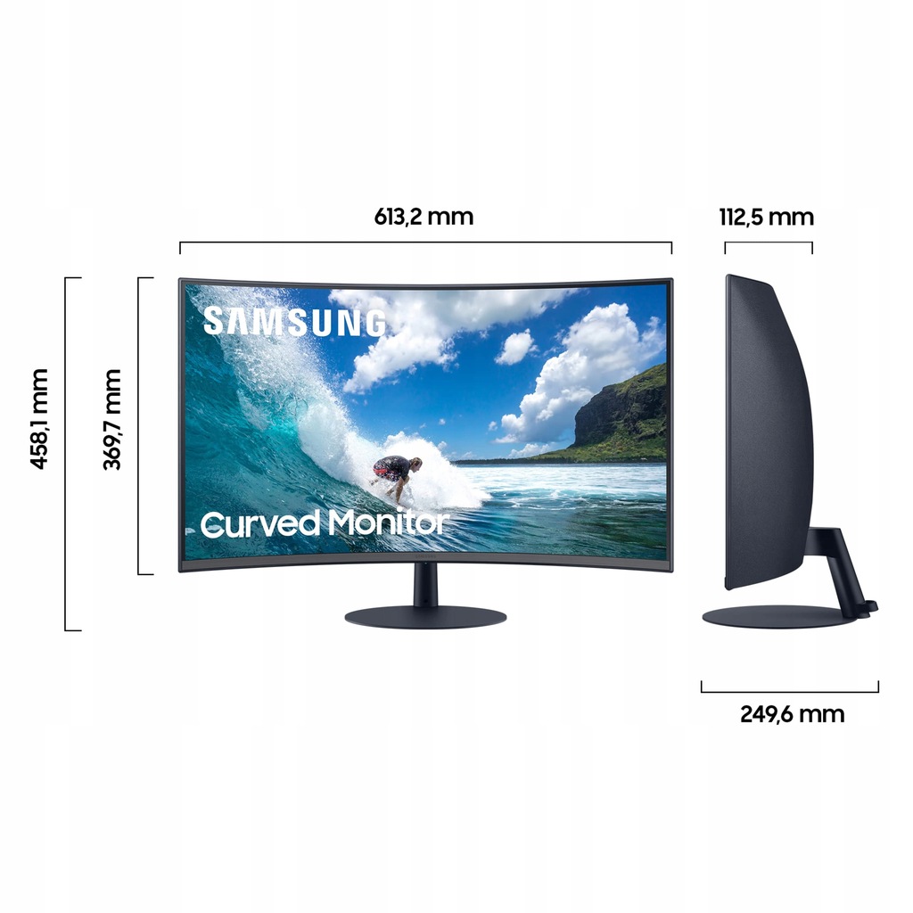 T55 ma największą krzywiznę, jaką kiedykolwiek zainstalowaliśmy w monitorze. Ten kamień milowy jest wynikiem lat niestrudzonych innowacji i wyznacza nowy punkt odniesienia w projektowaniu wyświetlaczy. Poznaj przyszłość w technologii monitorów już dziś.¹ W porównaniu z tradycyjnymi monitorami Samsung, krzywizna 1000R pokrywa prawie całe pole widzenia człowieka, zmniejszając zmęczenie oczu. Ponieważ widzisz cały ekran bez konieczności ponownego ustawiania ostrości, oczy nie męczą się tak szybko. Odkryj estetykę niemal bezramowego wyświetlacza, wzmocnioną wzorzystym tyłem i smukłą, metalową podstawą najwyższej jakości. Zakrzywiony monitor nie tylko przyciąga uwagę wszystkich, ale także służy jako obiekt dekoracyjny w Twoim wnętrzu. AMD FreeSync Dzięki AMD FreeSync i częstotliwości 75 Hz T55 zapewnia płynną rozgrywkę i płynne sceny. Tryb Eye Saver Tryb Samsung Eye Saver redukuje powodującą zmęczenie emisję niebieskiego światła. Połączenia Podłącz wszystkie swoje urządzenia wygodnie poprzez złącze HDMI, DP lub D-Sub. Nagroda Zakrzywiony monitor T55 otrzymał certyfikat Eye Comfort od TÜV Rheinland.² Badanie kliniczne Badania kliniczne wykazały, że zakrzywione wyświetlacze mniej obciążają oczy. Zakrzywiony monitor T55 Zakrzywiony monitor CF396 Zakrzywiony monitor CF398 Zakrzywiony monitor CR50 Zakrzywiony monitor UR59C Zabawa i praca w jednym: Dzięki inteligentnemu monitorowi możesz cieszyć się treściami rozrywkowymi na dużym monitorze i pracować mądrzej dzięki dużemu obszarowi wyświetlania i wielu funkcjom. Dzięki niesamowitemu czasowi reakcji liczy się każdy ruch. Zaskocz swoich przeciwników, gdy tylko ich zobaczysz i reaguj precyzyjnymi ruchami myszy. Monitory do gier reagują tak szybko, jak Ty. Zakrzywione monitory Samsung zaprojektowano tak, aby dopasowywały się do naturalnej krzywizny ludzkiego oka, zapewniając oczom większy komfort. ¹ „R” to skrót od promienia krzywizny. Im mniejszy promień, tym większa krzywizna. ² Certyfikat Eye Comfort Certyfikat dotyczy wyłącznie monitorów 24-calowych i 27-calowych.