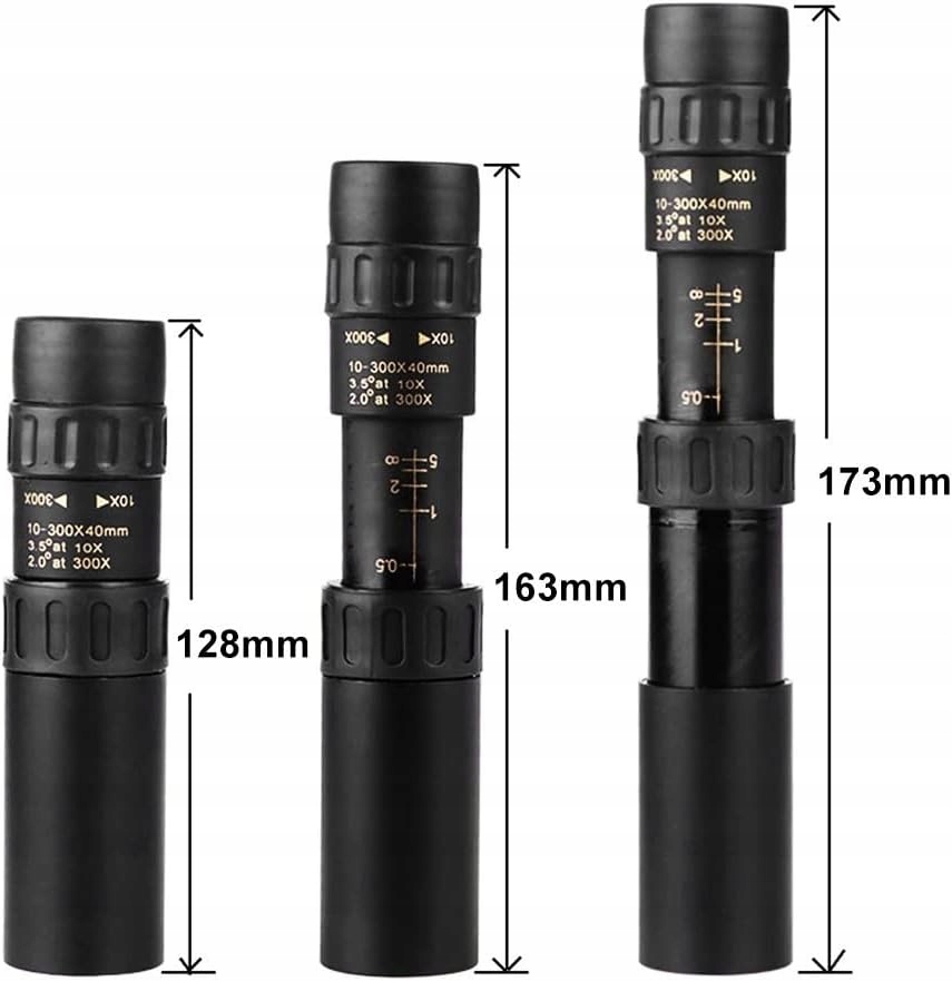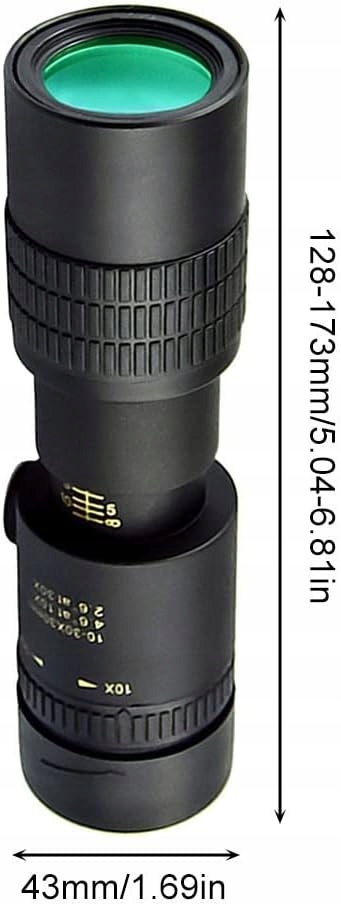 - Przenośność Rozmiar monokularu z zoomem wynosi około 173–128 x 43 mm (6,81–5,04 x 1,69 cala), a waga to 270 g. Jest mały, lekki i łatwy do przenoszenia.
