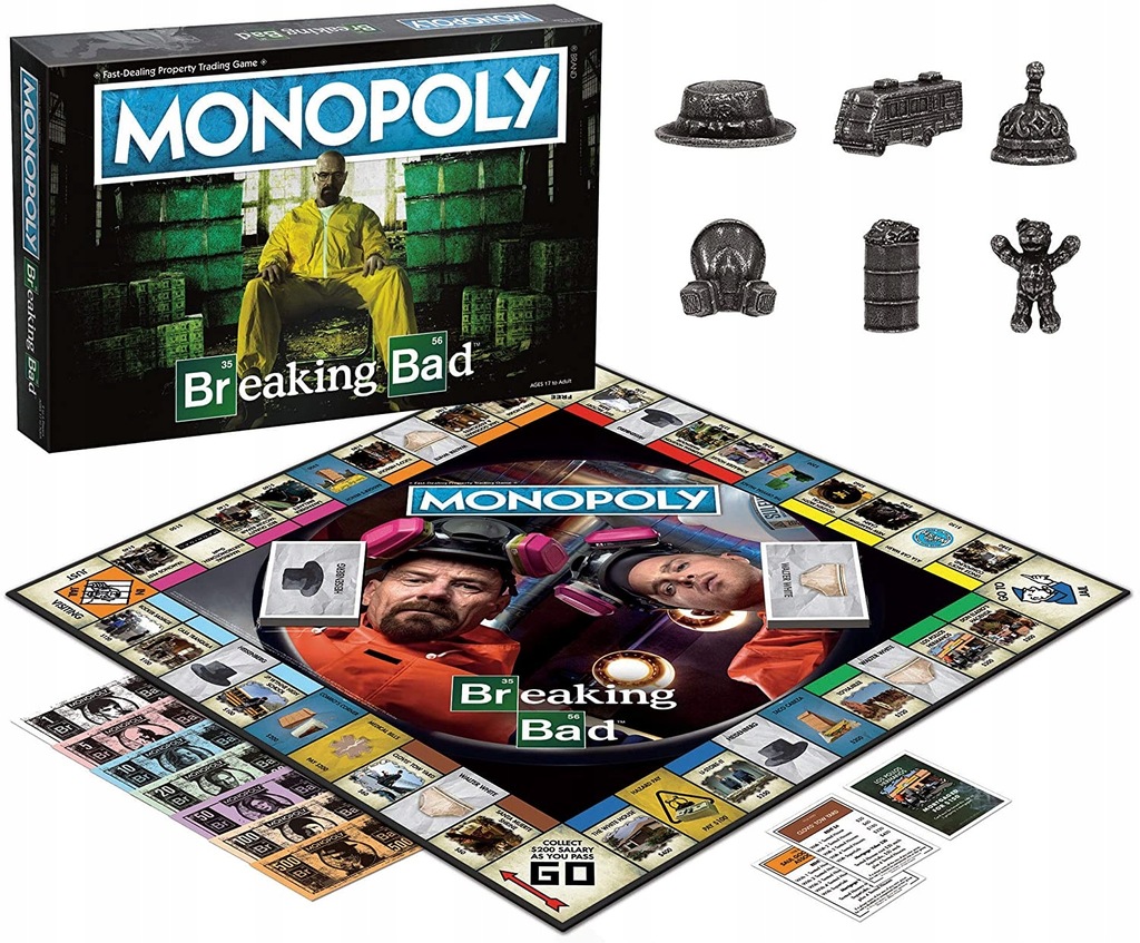 MONOPOLY Breaking BadWkrocz do świata Waltera White'a i zbuduj własne imperium!Podróżuj po planszy, odwiedzając lokalizacje znane z serialu Breaking Bad****zejmuj miejscówki, stawiaj domki pod namiotem lub superlaboratoria, by zdobyć przewagę na planszy!Zanim rozpoczniesz grę, wybierz jeden z sześciu metalowych pionków kolekcjonerskich - dzwonek Hectora, beczkę z pieniędzmi, kamper, kapelusz Heisenberga, różowego misia lub maskę gazową****epowtarzalne pionki to nie jedyny detal z serialu Breaking Bad****miast klasycznych kart Szansy i Kasy Społecznej, szukaj szczęścia losując z talii Waltera White`a i Heisenberga.Oba wcielenia bohatera mogą powiększyć Twoją fortunę lub przynieść porażkę**** co, gotowy na pichcenie?Zasady gryGracze wybierają pionki i pobierają banknoty o nominałach 500, 100, 50, 20, 10, 5 i 1****zgrywkę rozpoczyna osoba, która wyrzuci najwięcej oczek na kostce****daniem graczy jest zdobycie jak największej fortuny, wykupując pola na planszy.Uważajcie!Za wejście na czyjeś pole należy słono zapłacić.Wygrywa gracz, który zdobędzie przewagę na planszy i doprowadzi pozostałych uczestników do bankructwa****czegółowa instrukcja znajduje się w pudełku****wartość:plansza,6 kolekcjonerskich pionków,28 kart Tytuł Własności,16 kart Heisenberg,16 kart Walter White,1 plik banknotów MONOPOLY,32 domy pod namiotem, 12 superlaboratoria,2 kostki,instrukcja.Cechy gry:Liczba graczy 2-6,Czas gry 1-3 h,Język wydania polski.Wiek: +18