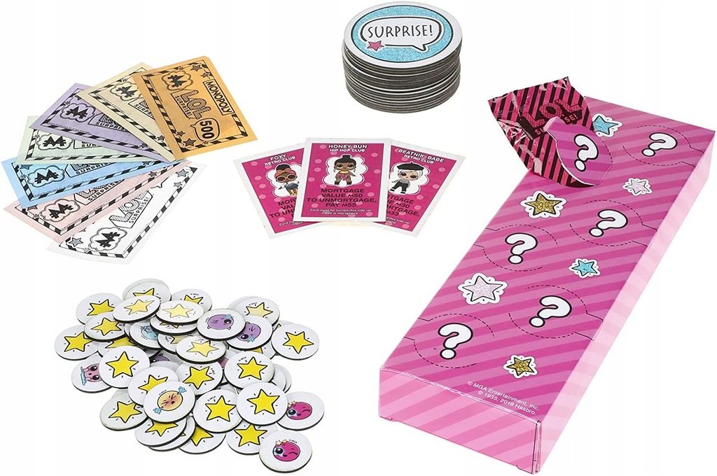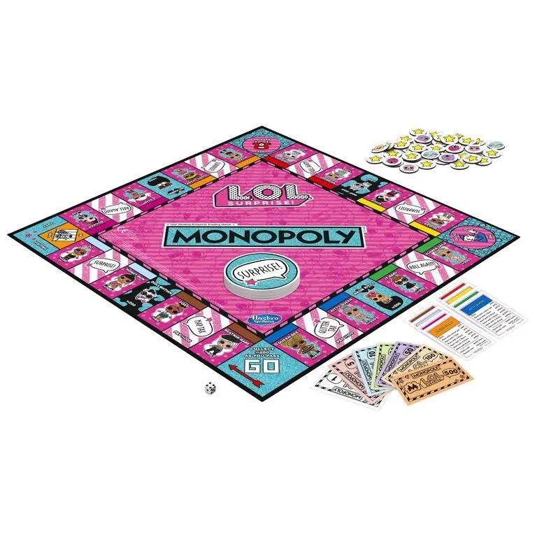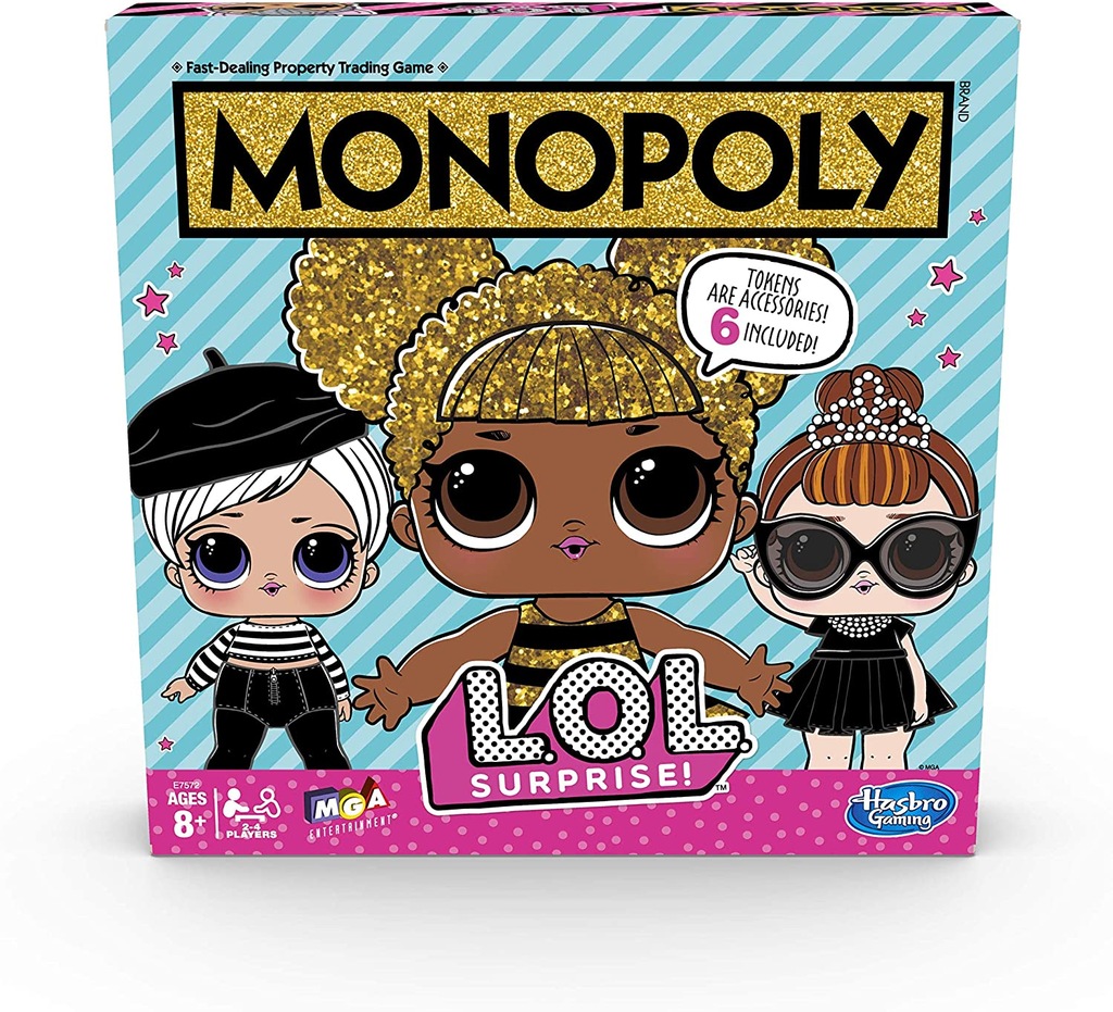 The Monopoly Game meets the cute L. O. L. Surprise. Instead of locations and properties, in this Monopoly: L. O. L. Surprise. Edition game players buy, sell, and swap other players' Dolls shown on the game-boards, aiming to collect the rare ones. Surprise cards replace chance cards, stars and emoji's replace houses and hotels and the tokens are authentic L. O. L. Surprise doll accessories. Players are offered an exciting surprise experience when they unwrap the tokens. What a gift idea for L. O. L. Surprise fans as well as Monopoly fans. For kids ages 8 and up. L. O. L. Surprise is a trademark of MGA entertainment, Inc. In the U. S. And other Countries. The Hasbro, Hasbro Gaming, Parker brothers and Monopoly names and logos, the distinctive design of the game-boards, the four corner squares, the Mr. Monopoly name and character as well as each of the distinctive elements of the board and playing pieces are trademarks of Hasbro for its property trading game and game equipment.