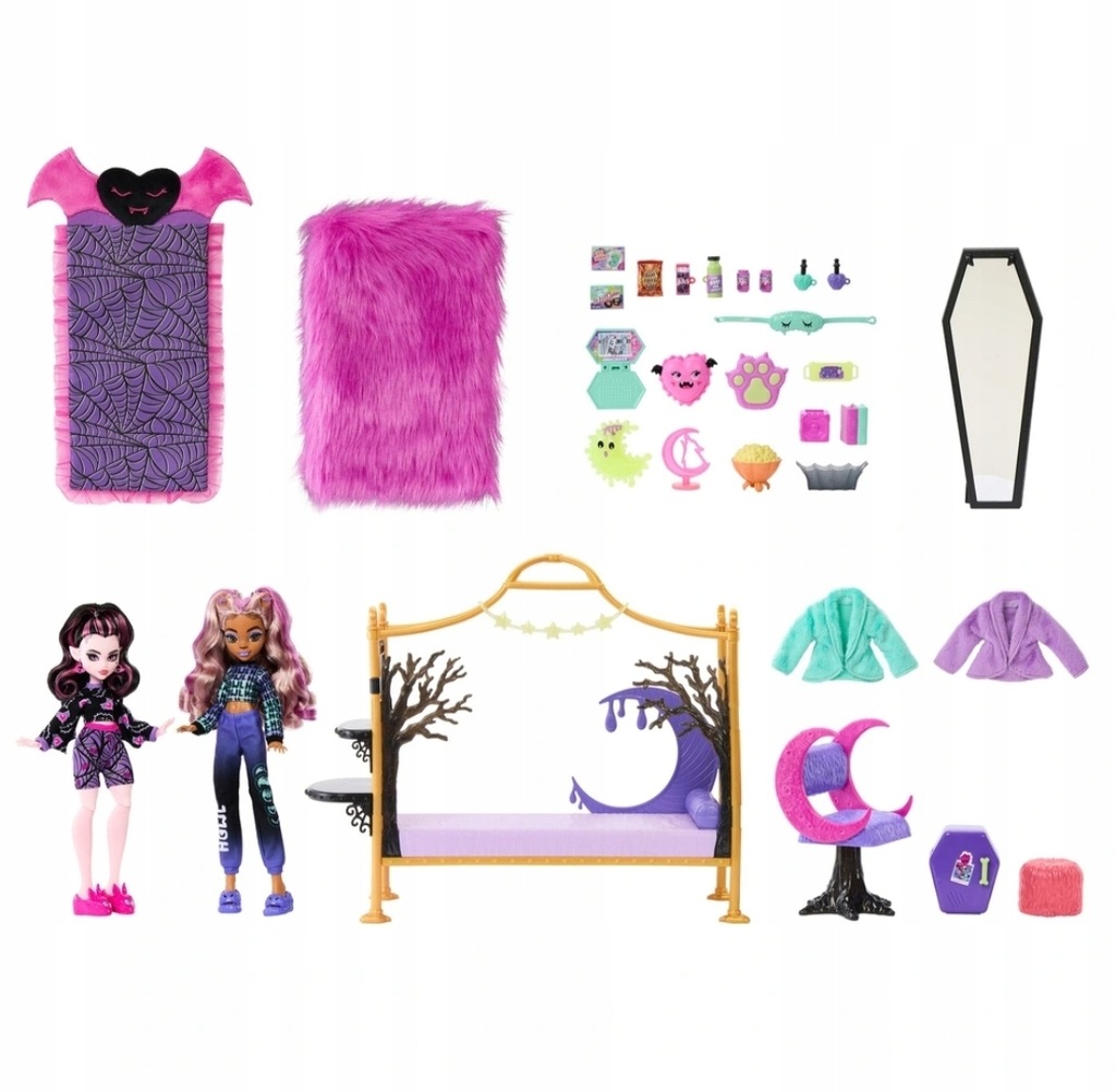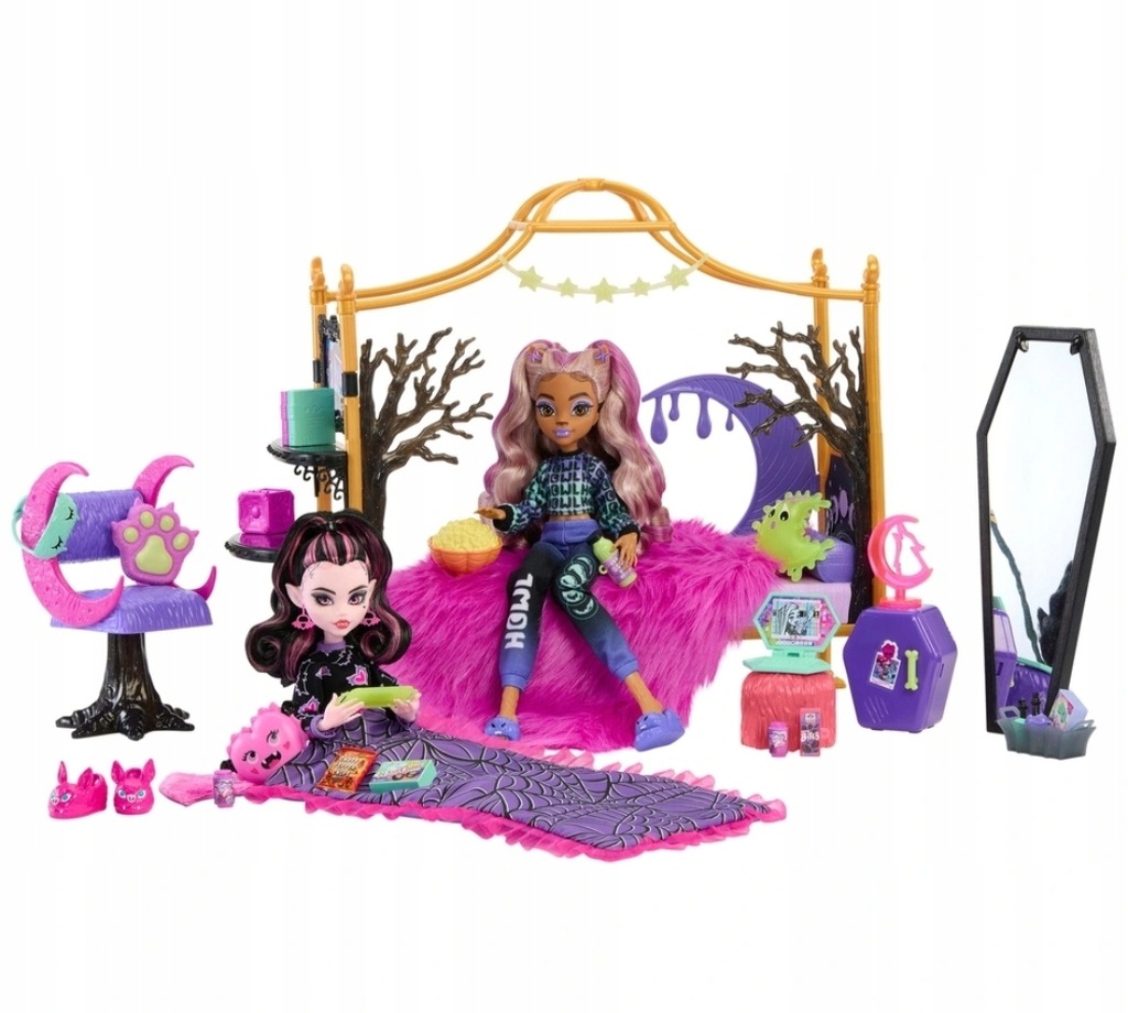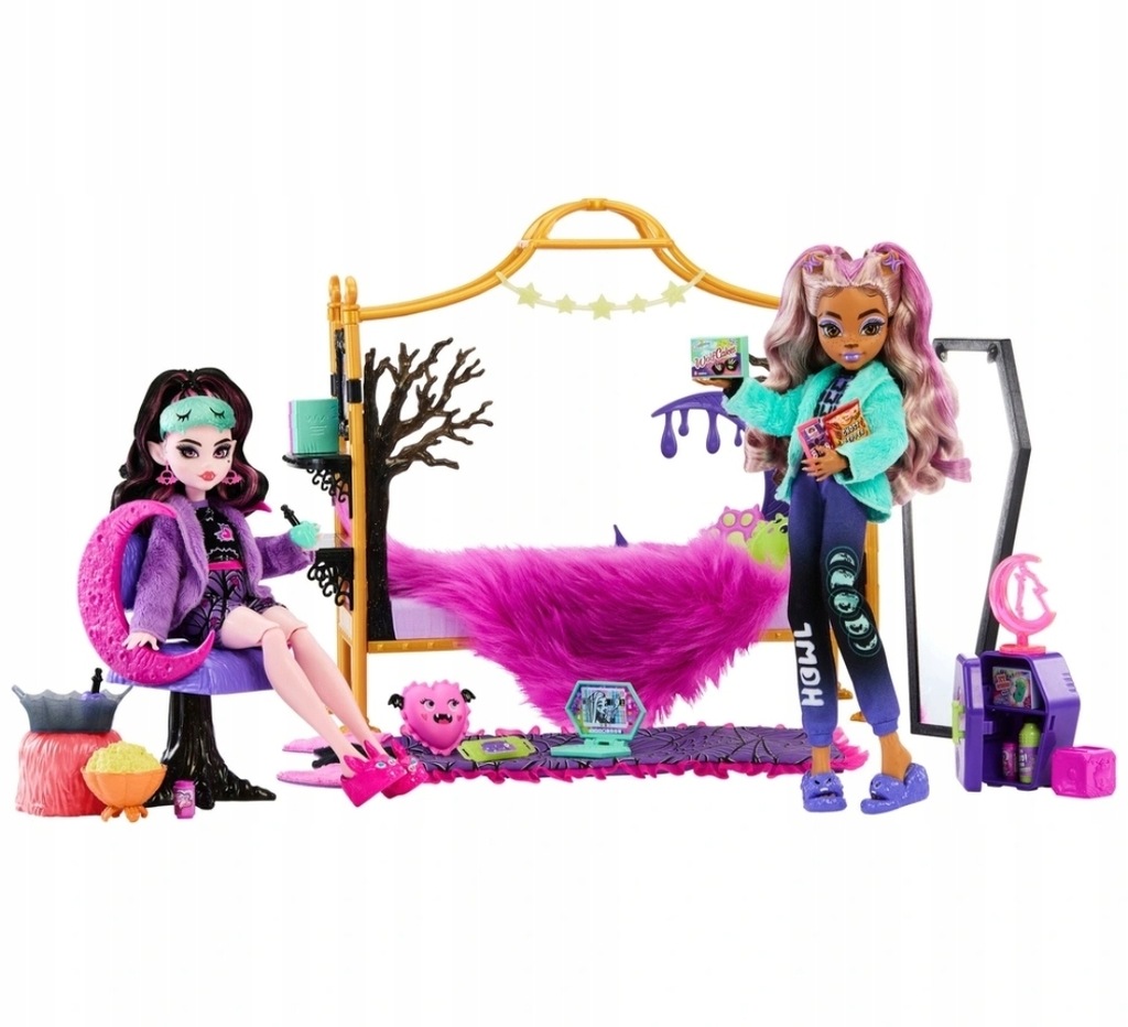 Ten zestaw Monster High organizuje upiorną piżamową imprezę. Zawiera dwie lalki Monster High w wygodnych i uroczych strojach, a także meble do sypialni, przekąski i pasujące akcesoria. Dzięki ponad 20 akcesoriom dzieci w wieku od 4 lat mogą wymyślić mnóstwo zabawnych historii dla lalki Clawdeen Wolf i Draculaura!