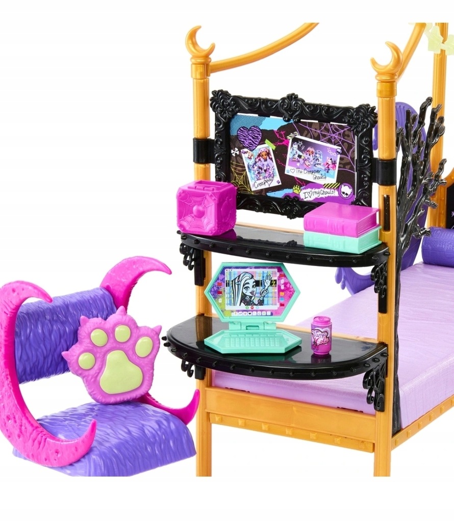 Zawartość: 1x lalka Draculaura, 1x lalka Clawdeen Wolf, pasujące meble do sypialni i akcesoria