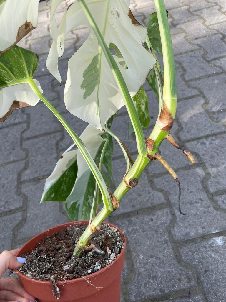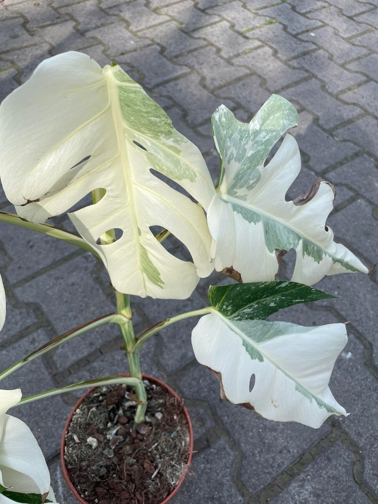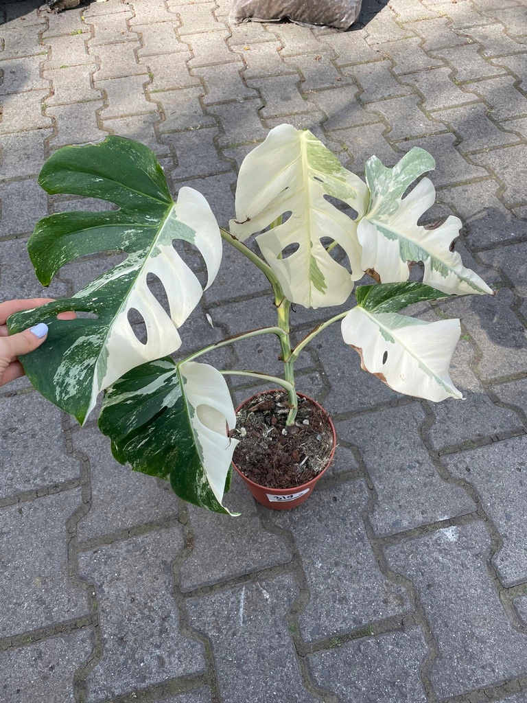 Przepiękna monstera variegata dostępna, ma 6 liści dość mocno wybarwionych, gdzieniegdzie odrzuca biel (normalne u tak białej monsterki) szczyt idzie w biel i mint ale łodyga ma spore predyspozycje do większej ilości zieleni :) doniczka 14cm, wysokość ok 60cm.