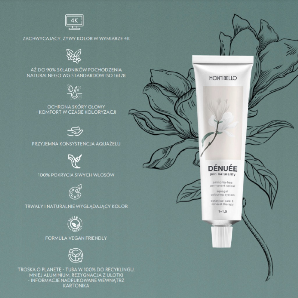DÉNUÉE to pierwsza i jedyna naturalna oraz permanentna farba na bazie wody, bez amoniaku, która pozwala na stworzenie naturalnych, pełnych blasku koloryzacji.