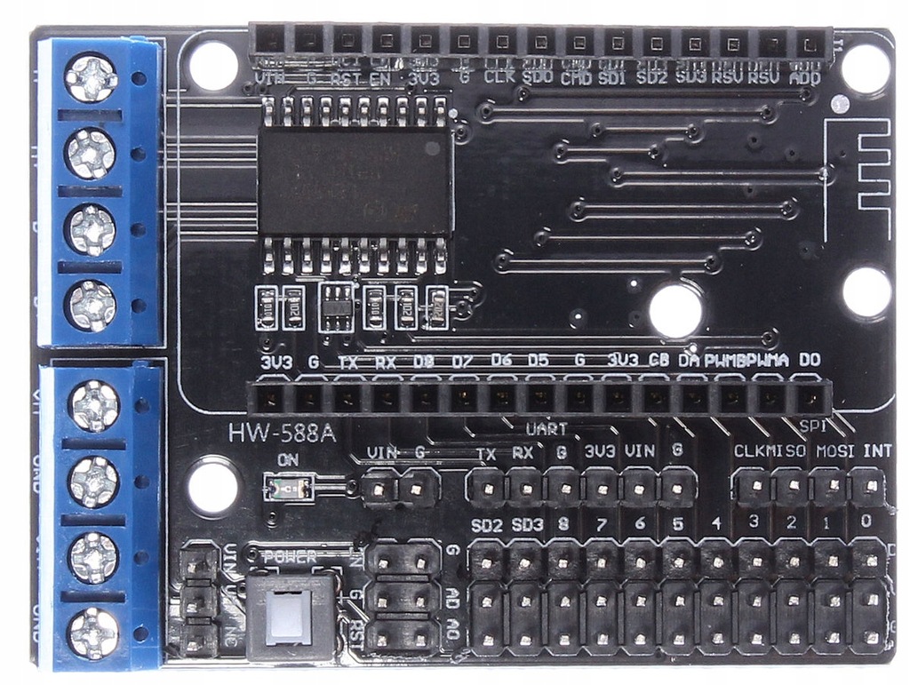 Sterowanie dwoma silnikami DC lub jednym krokowym odbywa się za pomocą złącz A-, A+ – Silnik A / B-, B+ – Silnik B. Możliwość podłączenia jednego źródła zasilania i za pomocą zwory VIN / VM połączyć zasilanie silników z zasilaniem układu NodeMcu.