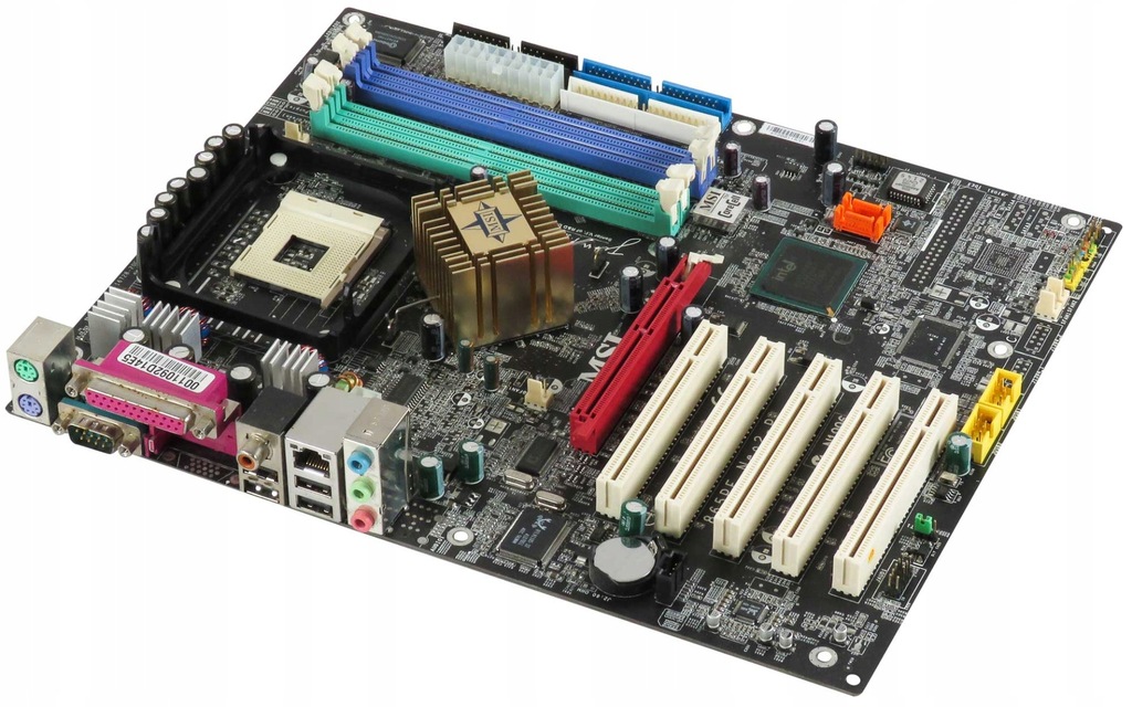- Gniazda rozszerzeń wewnętrzne: AGP, 5x PCI, 2x IDE, 2x SATA