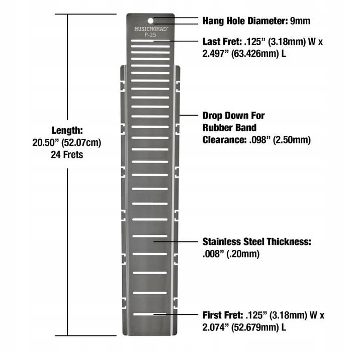 Fret Shield doskonale pasuje do wszystkich gitar ze skalą 25″, w których zastosowano standardowy współczynnik 17.817 do obliczania pozycji progów, powszechnie używany w instrumentach marki PRS. Wybierz Music Nomad MN802 i ciesz się spokojem, wiedząc, że Twoja gitara jest w pełni chroniona podczas konserwacji!