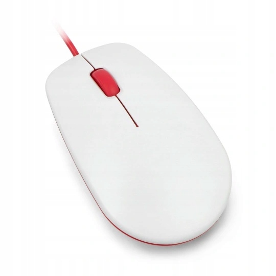 Minimalistyczna mysz optyczna przewodowa Raspberry Pi 4B/3B+/3B/2B oficjalna - czerwono-biała - ma ergonomiczny design i stosunkowo niewielką wysokość (wymiary 115 x 75 x 33 mm). Mamy do dyspozycji trzy klasyczne przyciski, w tym jeden na pokrętle.