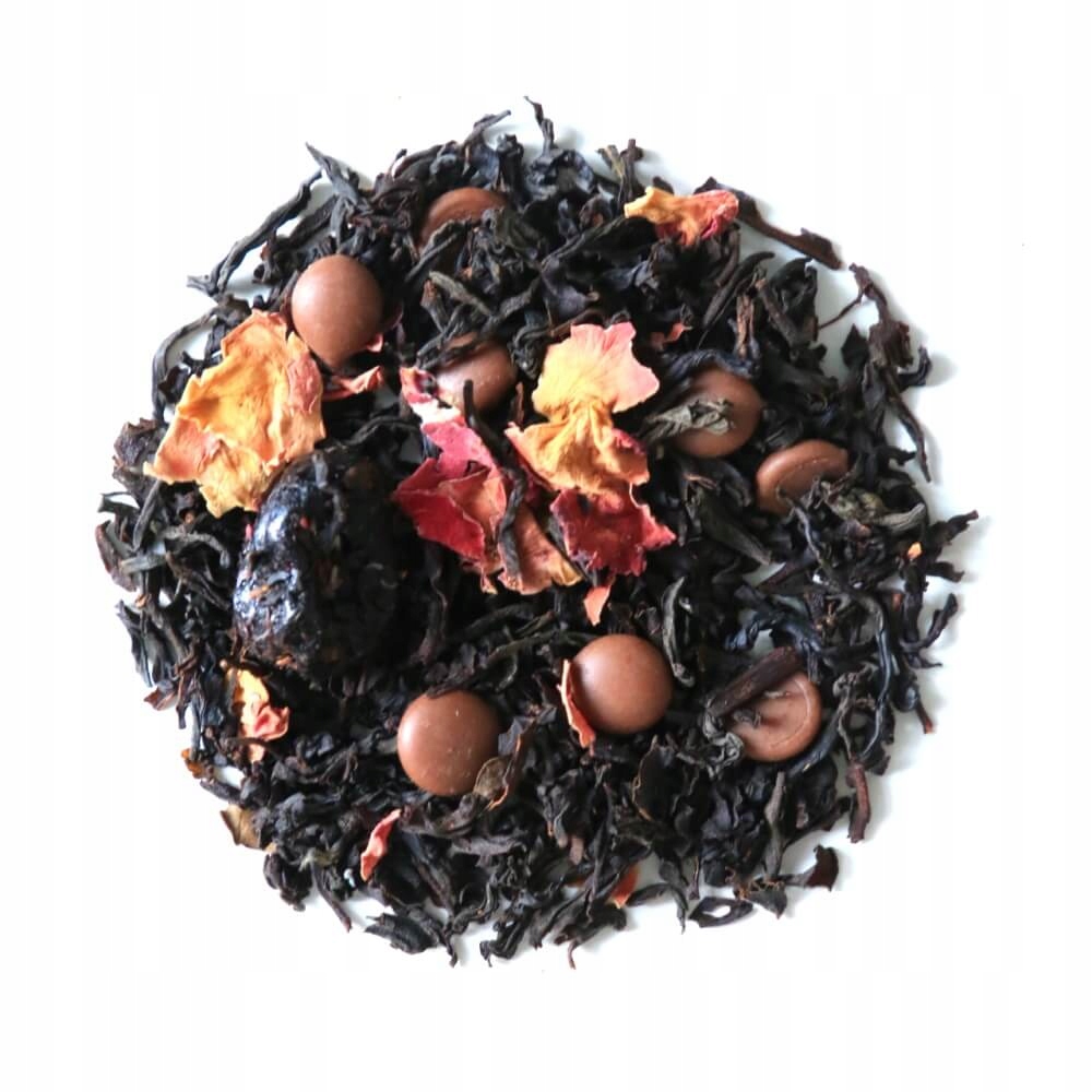 Składniki: herbata czarna, czekoladki, kwiat róży, wiśnie, aromat