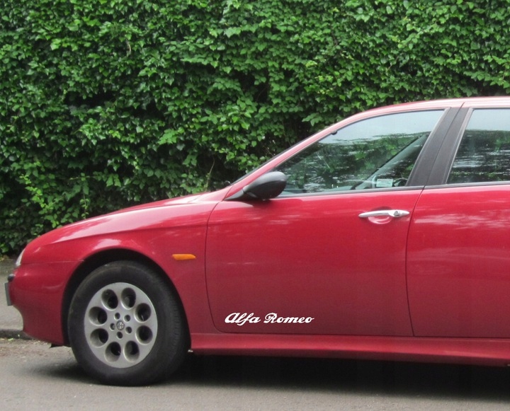 Naklejki z napisem Alfa Romeo na szybę lub karoserię.
