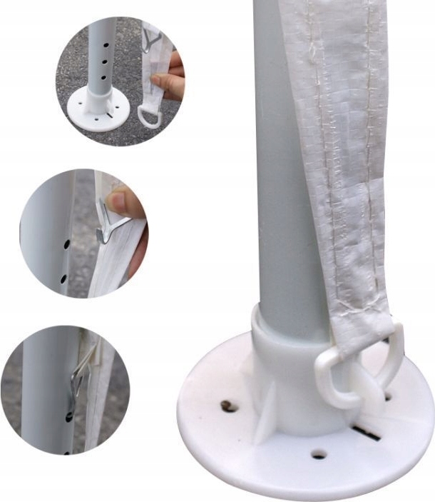 Szkielet namiotu wykonany jest z grubych, metalowych rurek malowanych proszkowo, o średnicy 32/25/25 mm, co zapewnia stabilność i odporność na korozję. Solidna konstrukcja gwarantuje trwałość, nawet przy intensywnym użytkowaniu. Każda z nóg namiotu jest mocowana do podłoża za pomocą śledzi, co zwiększa jego stabilność. Zadaszenie i ściany wykonano z wytrzymałego oraz odpornego na warunki atmosferyczne polietylenu o gramaturze 100 g/m2 w eleganckim, białym kolorze.