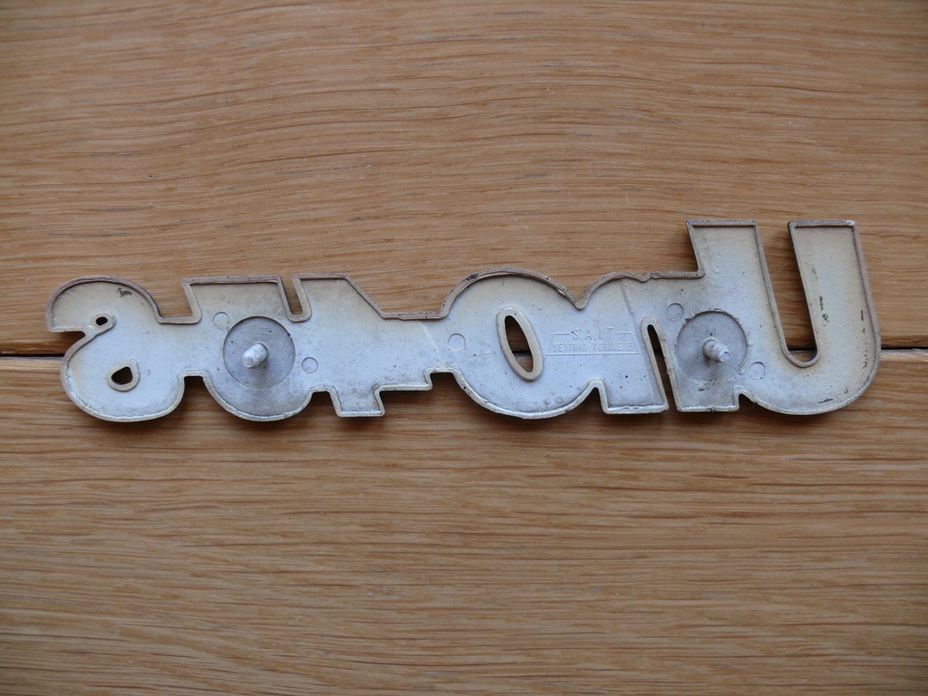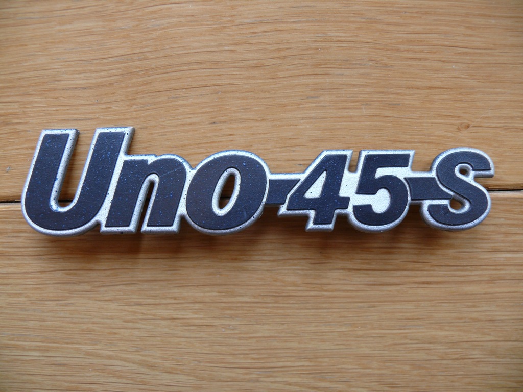 Z mojej kolekcji znaczków samochodowych - sprzedam napis UNO 45 S do starego Fiata Uno mk1. Stan znaczka jest świetny, ma wszystkie bolce montażowe, lecz jedynym felerem jest górna krawędź umalowana na granatowo - pewnie podczas lakierowania auta, z którego znaczek pochodzi. Polecam też inne moje aukcje, na których będę wystawiał i inne emblematy.
