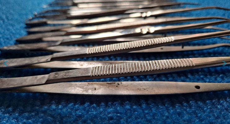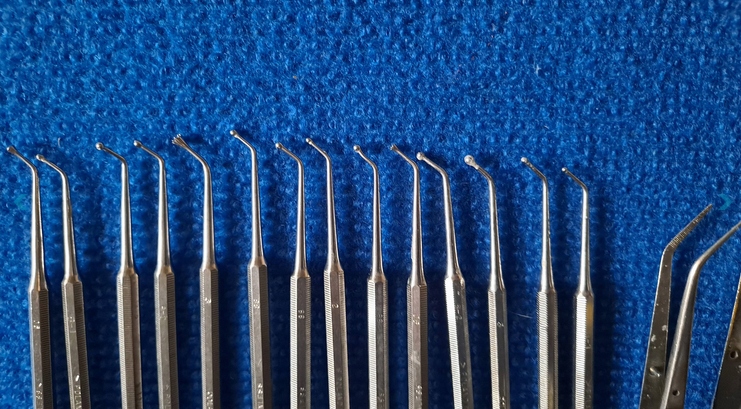 Używane narzędzia stomatologiczne - w zestawie znajduje się 20 szt ( 6 pęset stomatologicznych i 14 upychadeł). Widoczne są minimalne ślady użytkowania.