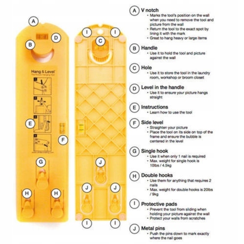 Wyeliminuj dodatkowe dziury na ścianie za pomocą tego niesamowitego narzędzia do zawieszania obrazów! Zawieś swoje obrazy łatwo bez bałaganu i robienia niepotrzebnych dziur w ścianie. Możesz użyć tego narzędzia na wszystkich materiałach ściennych. Istnieją wbudowane poziomy, które zapewnią, że wszystkie Twoje zdjęcia będą proste. Metalowe kołki na okuciu do zawieszania obrazu wskażą, gdzie powinien iść gwóźdź.