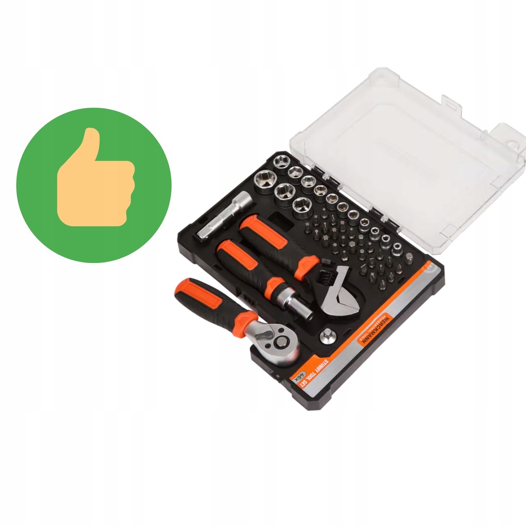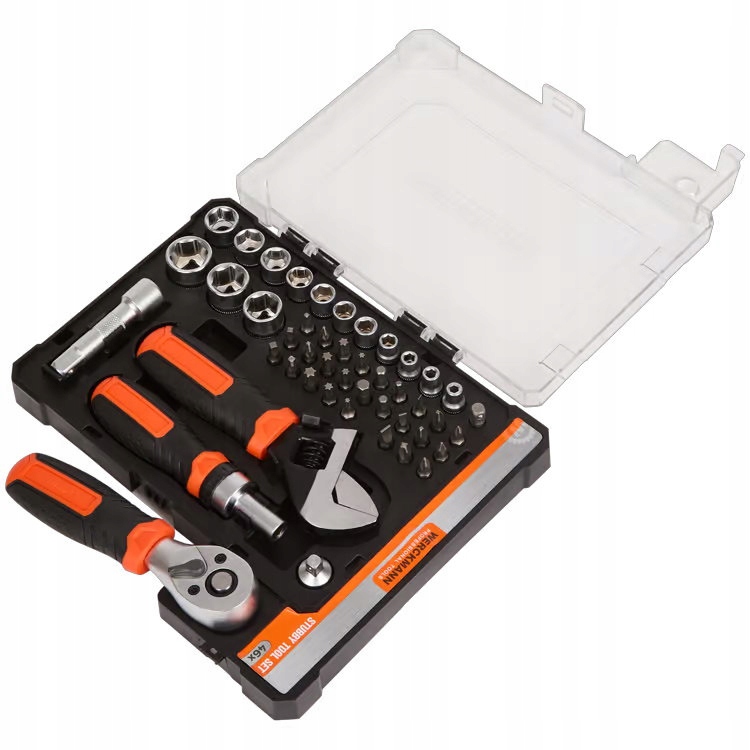 Zawiera niezbędne elementy, takie jak nasadki, bity, uchwyty i adaptery, w tym klucz nastawny z grzechotką oraz różne rozmiary nasadek, co sprawia, że jest idealny do szerokiego zakresu prac.