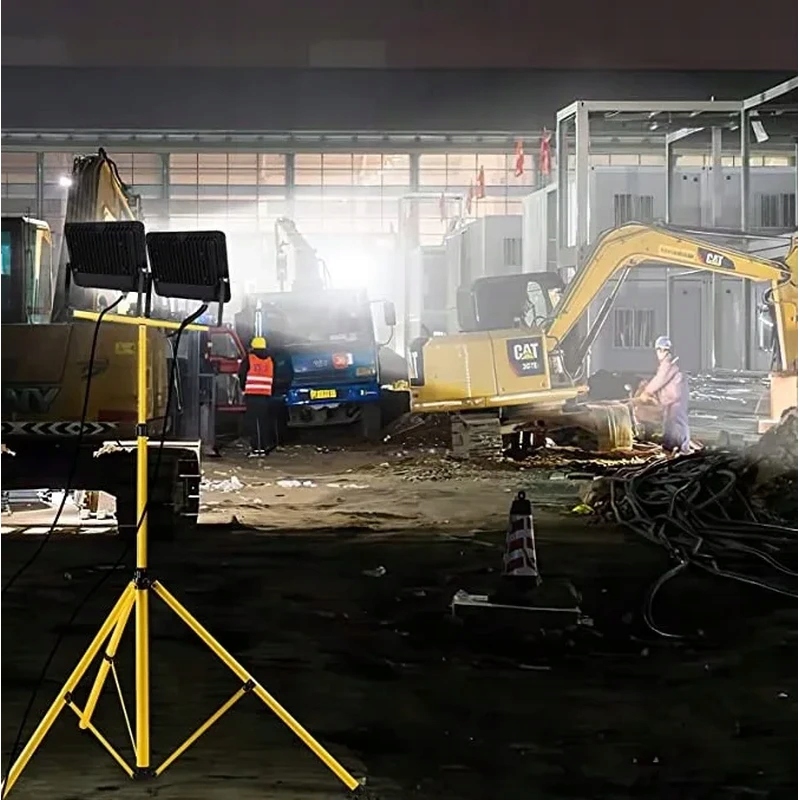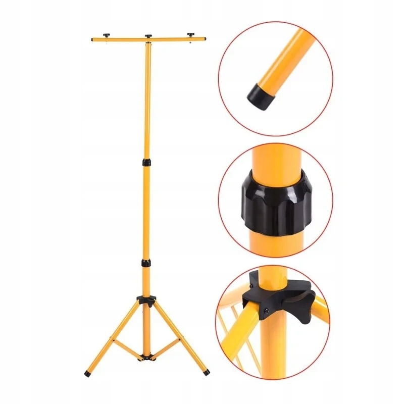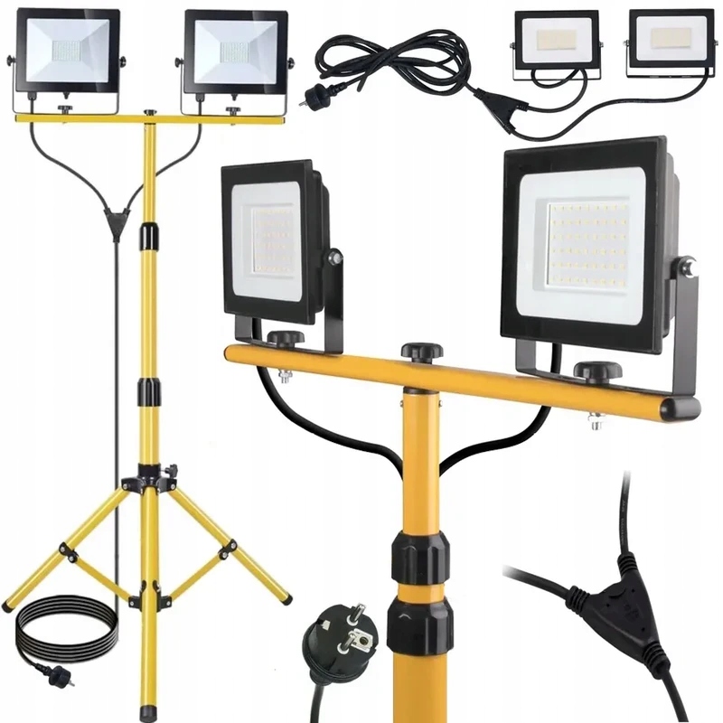 Naświetlacz lampa led statyw stojak roboczy 100w ip66 150cm PREMIUM Wszechstronny statyw roboczy-naświetlacz podwójny (2x 50W), idealny do prac związanych z remontem, budowami, konserwacją, oraz samym doświetleniem otoczenia. Produkt posiada solidną metalową konstrukcję. Podstawa typu tri-pod regulowana, z blokadą rozstawu. Wysokość regulowana za pomocą szerokości rozstawu nóg oraz dwóch wysuwanych członów wyposażonych w blokadę gwintową. Mocny strumień światła w barwie biały zimny doskonale doświetla otoczenie. Odpowiednie odprowadzanie ciepła znacznie przedłuża żywotność zastosowanych diod LED w naświetlaczach. Stopień ochrony IP66 gwarantuje ochronę przed wodą i innymi zanieczyszczeniami. Solidna, odporna na uszkodzenia i warunki atmosferyczne konstrukcja. Naświetlacze są fabrycznie połączone przewodami zakończonymi wtyczką. Dzięki temu cały zestaw jest całkowicie szczelny. W zestawie: