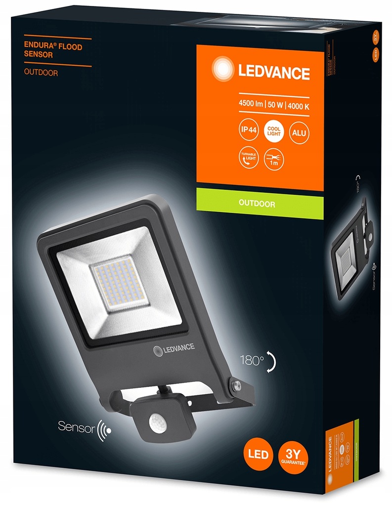 NAŚWIETLACZ ENDURA® FLOOD Sensor Cool White 50 W 4000 K DG to wydajne oświetlenie zewnętrzne idealne do budynków, ogrodów i innych przestrzeni.