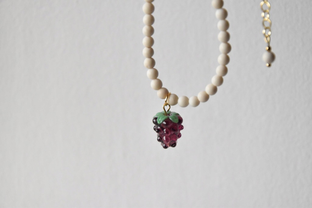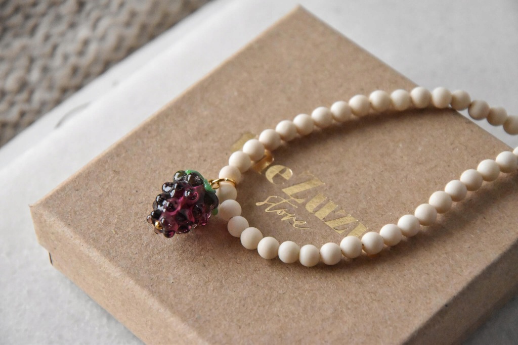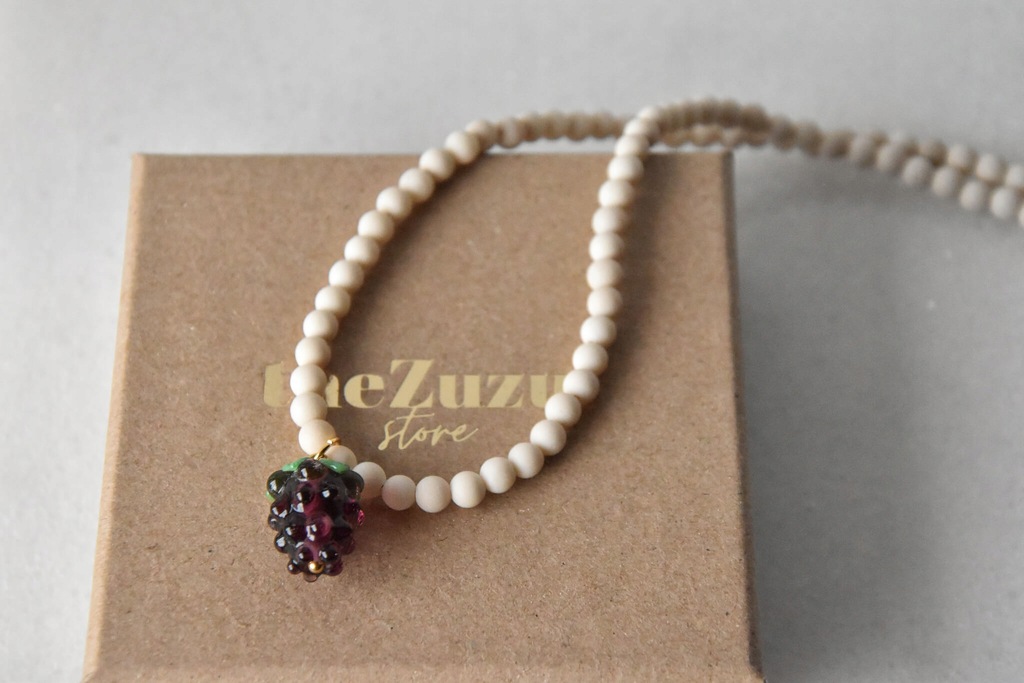 Naszyjnik z tradycyjnym zapięciem, wykonany ręcznie z kamieni naturalnych ze szklanym owockiem. Użyty w niej kamień rzeczny ma wiele właściwości.