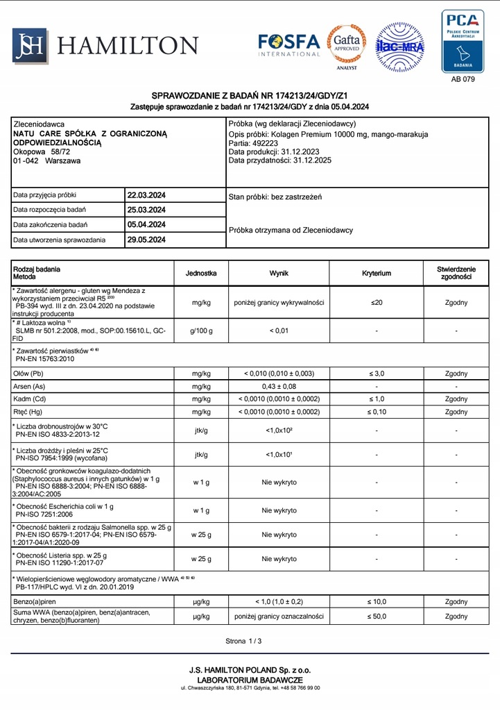 Produkty Natu.Care są badane przez akredytowane laboratorium J.S. Hamilton Poland. Skład Kolagenu Premium (jak i wszystkich innych produktów) poddaliśmy badaniom mikrobiologicznym i tym na obecność GMO, WWA, laktozy, glutenu oraz metali ciężkich.