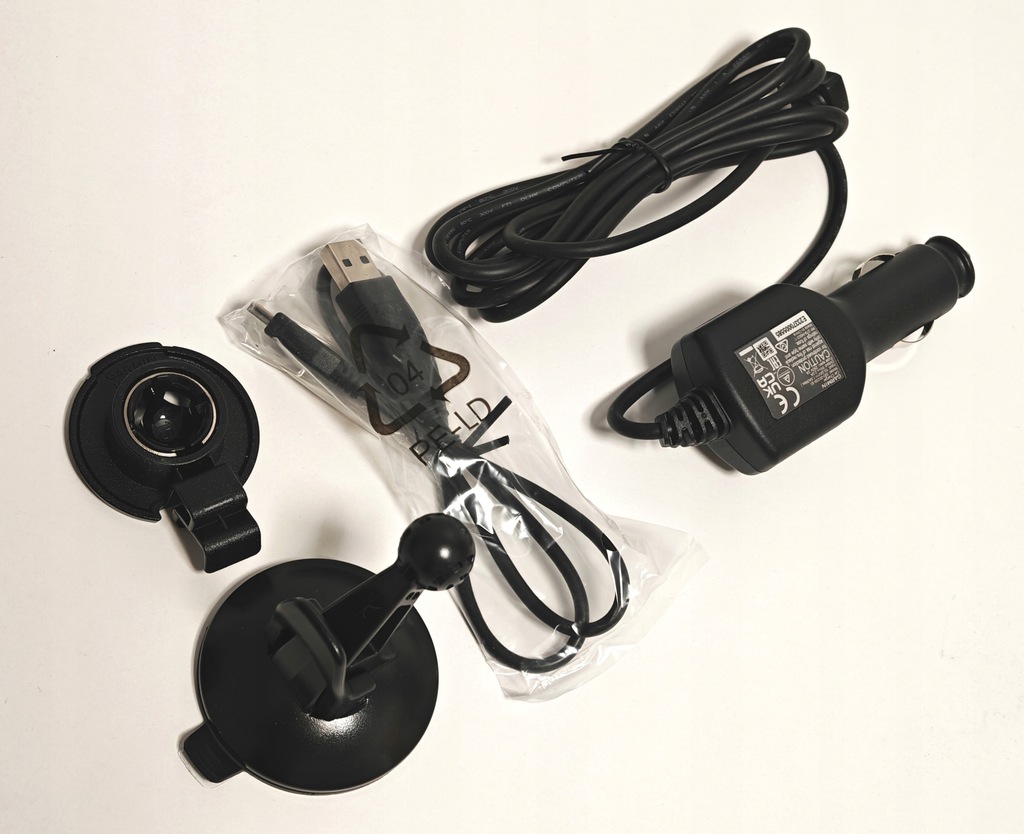 W zestawie znajduje się przewód USB, uchwyt, ładowarka samochodowa
