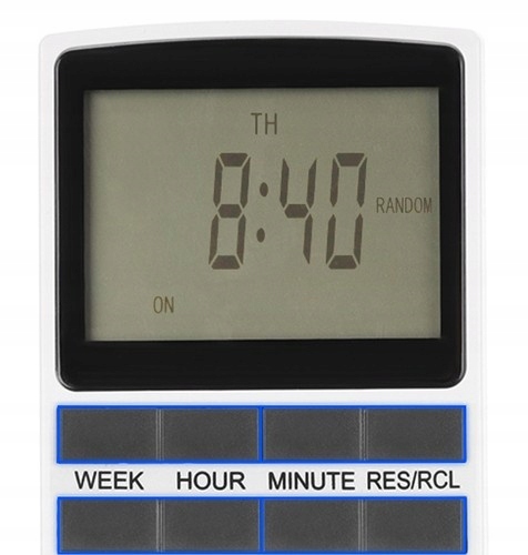 Programator czasowy to urządzenie, które będzie przydatne w każdym gospodarstwie domowym, biurze czy sklepie. Dzięki niemu możemy kontrolować dni, godziny, a nawet minuty działania urządzenia, które jest do niego podłączone. Posiada on 8 opisanych przycisków + RESET oraz czytelny wyświetlacz, na którym zobaczyć możemy aktualną godzinę, dzień i program. Możemy podłączyć do niego wszystkie urządzenia, które zasilane są napięciem 230V np. ogrzewanie, klimatyzacja, bojler czy lampki świąteczne. Nie musisz przejmować się, że w pośpiechu zapomnisz wyłączyć jedno z urządzeń co będzie wiązało się z większym rachunkiem za prąd. Programator pozwoli Ci zautomatyzować wszystko co zasilane jest energią elektryczną. Uchroni Cię także przed potencjalnym złodziejem włączając i wyłączając np. lampkę czy telewizor w godzinach o których zazwyczaj jesteś w domu. DUŻY I WYRAŹNY WYŚWIETLACZ LCD Ułatwi odczyt aktualnego programu, godziny i dnia. TRYB 12 I 24 GODZINNY Dzięki temu trybowi możesz zaprogramować daną czynność z odstępem 12 lub 24 godzin za pomocą jednego przycisku. POKAZUJE DZIEŃ I GODZINĘ Urządzenie może posłużyć również jako zegarek. Na wyświetlaczy znajdują się informacje o aktualnym dniu godzinie oraz minucie. CZAS ZIMOWY I LETNI Programator czasowy posiada tryb czasu letniego oraz zimowego, dzięki temu możesz w łatwy i szybki sposób przesunąć godzinę do przodu lub do tyłu. POSIADA AKUMULATOR Urządzenie posiada wbudowany akumulator NIMH 1,2V, dzięki czemu nawet gdy zabraknie prądu podtrzyma on działanie podłączonego do niego sprzętu. CHRONI PRZED ZŁODZIEJEM Programator sprawdzi się również podczas Twojej dłuższej nieobecności. Nie chcesz, aby potencjalny złodziej wiedział że nie ma Cię w domu? Zaprogramuj urządzenie tak aby włączało i wyłączało lampkę bądź telewizor w godzinach, których zazwyczaj jesteś w domu. PANEL STEROWANIA RST/RCL - przywołanie zapisanych lub nadpisywanie programów WEEK - ustawienie dnia tygodnia w kombinacji z przyciskiem TIMER lub CLOCK HOUR - ustawienie godziny w kombinacji z przyciskiem TIMER lub CLOCK MIN - ustawienie minuty w kombinacji z przyciskiem TIMER lub CLOCK CLOCK - ustawienie bieżącej godziny w kombinacji z WEEK, HOUR, MIN; uruchomienie funkcji czasu letniego (oryginalnie zimowy) w kombinacji z ON/AUTO/OF; wybór trybu 12 lub 24 - godzinnego w kombinacji z TIMER. RANDOM - włączenie lub wyłączenie trybu losowego TIMER - ustawianie programów w kombinacji z przyciskami WEEK, HOUR, MIN, wybór trybu 12 lub 24 - godzinnego w kombinacji z CLOCK. ON/AUTO/OFF - wybór trybu pracy programatora RESET - kasowanie wszystkich danych z pamięci (aby wykonać reset należy należy włożyć do otworu np. wykałaczkę i przytrzymać 10 sek). Przed 1 użyciem należy zresetować urządzenie.