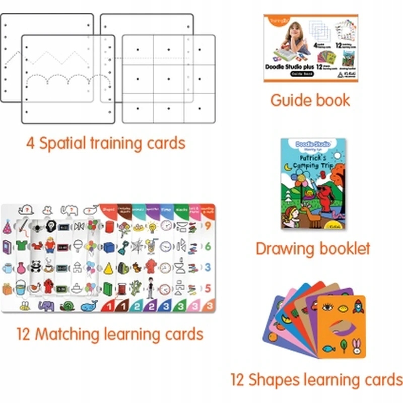 Studio rysunkowe plusWzmacnia małą motorykę oraz umiejętność pisaniaRozwija logiczne myślenie.Czasem dzieci mają problemy z pisaniem w określonej przestrzeni Studio rysunkowe pozwala rozwiązać ten problem W odróżnieniu od różnych materiałów edukacyjnych, oryginalne studio rysunku posiada 4 karty do ćwiczeń, stworzone tak by pomóc dzieciom zrozumieć położenie, kierunek i odległość- bardzo przydatne do ćwiczeń przed rozpoczęciem nauki pisania Dziecko powinno prowadzić linie po śladach narysowanych przez opiekuna Rodzice mogą regulować szerokość przestrzeni rysunkowej w zależności od postępu dziecka.Więcej materiałów do nauki można znależć w przewodniku.Oryginalne studio rysunku posiada 4 karty do ćwiczeń, stworzone tak, by pomóc dzieciom zrozumieć położenie, kierunek i odległość rysowanych linii-ćwiczenie grafomotoryczne przydatne przed rozpoczęciem nauki pisania Dziecko powinno prowadzić linie po śladach narysowanych przez opiekuna Rodzice mogą regulować szerokość przestrzeni rysunkowej w zależności od postępu dziecka Zestaw dołączonych plansz pomaga rozwijać pojęcie liczby, ćwiczyć zdolności zauważania podobieństw i różnic między obrazkami.Plansze dołączone do STUDIA RYSUNKOWEGO PLUS umożliwiają wymyślanie razem z dzieckiem różnego rodzaju zadań i łamigłówek, co wspiera zdolność do współpracy i uczestniczenia w takich zabawach i grach, które wymagają przestrzegania reguł.