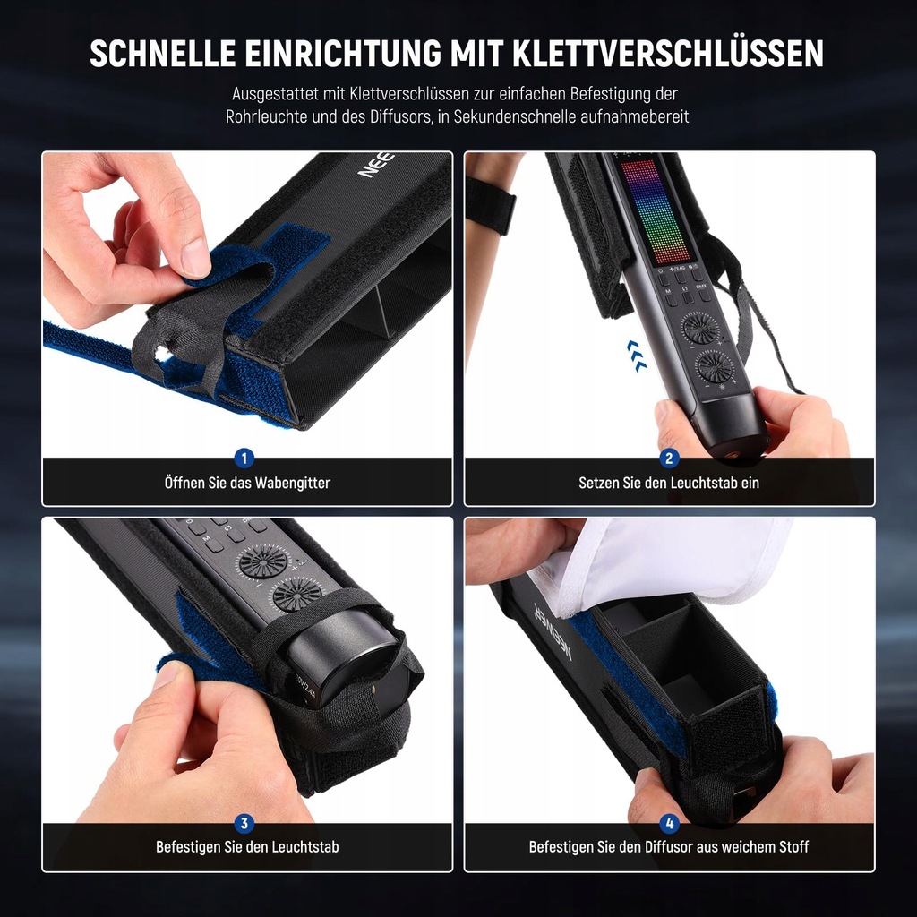 - nazwa przedmiotu: NEEWER LED Lichtdiffusor Set für TL120C RGB LED Leuchtstab, LED Röhrenstreifen Light Diffuser mit Wabengitter, Tragetasche, Klettverschlüsse für Foto Video Live Stream Portrait Produktaufnahmen, NS10S
