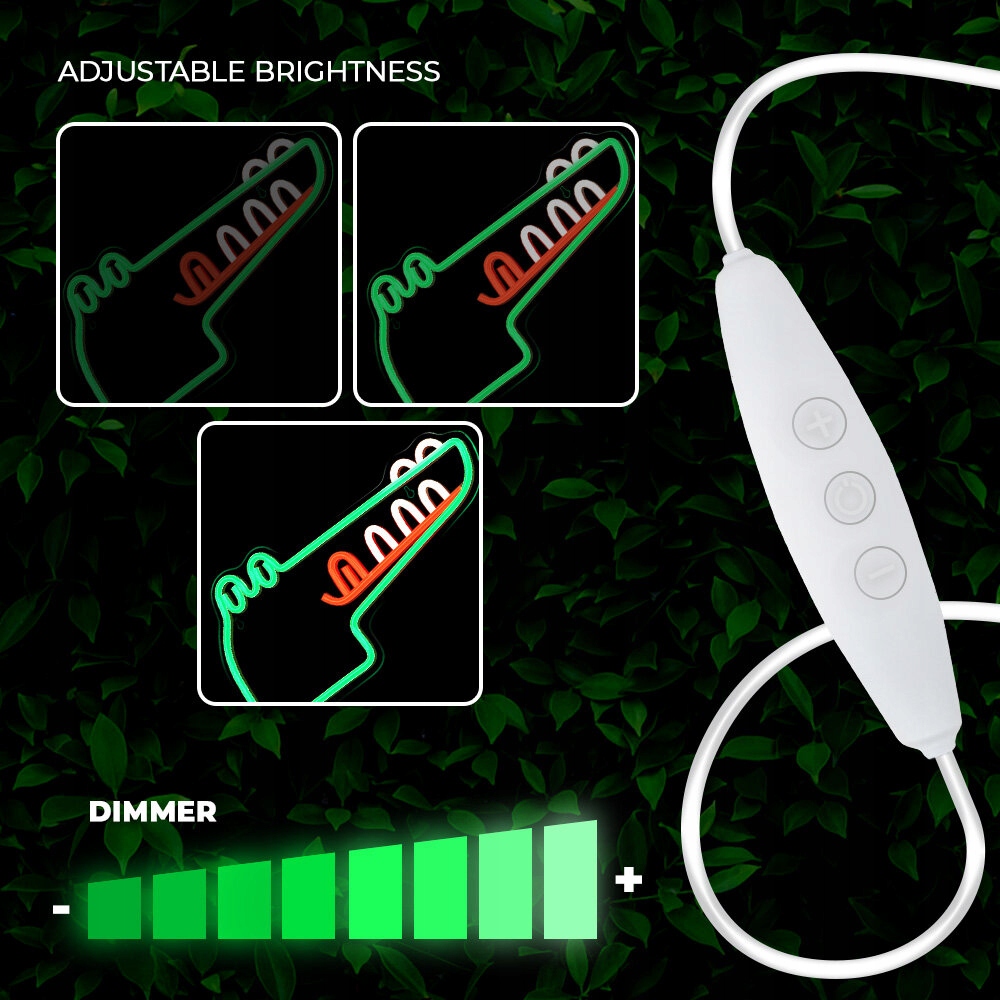 Funkcja ściemniania wbudowana w urządzenie umożliwia regulację jasności światła emitowanego przez neon. Ponadto Dino został wyposażony w przełącznik ON/OFF, który umożliwia łatwe włączanie i wyłączanie neonu bez konieczności odłączania go od źródła zasilania.