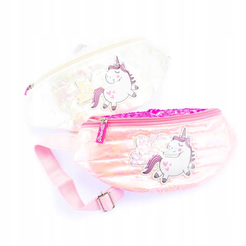 Regulowany pasek, kieszeń na zamek, aplikacja z jednorożcem z przodu nerki.