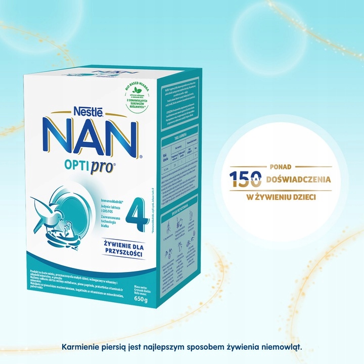 NAN OPTIPRO® 4 mleko modyfikowane w proszku dla dzieci po 2. roku życia stanowi tylko część zróżnicowanej diety dziecka. Nie może zastępować mleka matki przez pierwsze sześć miesięcy życia niemowlęcia. Decyzję o wprowadzaniu nowych posiłków zawsze konsultuj z lekarzem.