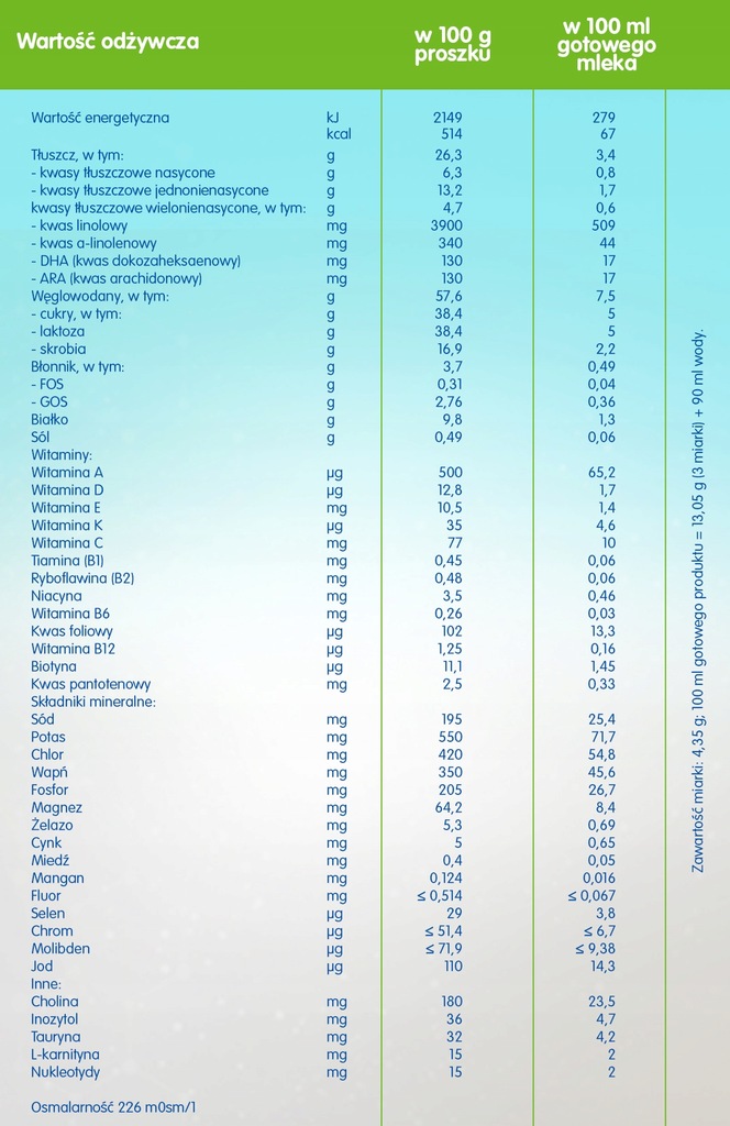 laktoza (z mleka), oleje roślinne (olej słonecznikowy, olej kokosowy, olej rzepakowy), skrobia ziemniaczana (18%), izolat białka serwatkowego (z mleka), galaktooligosacharydy (GOS) z mleka (6,2%), koncentrat białka serwatkowego (z mleka), cytrynian potasu, glicerofosforan wapnia, olej rybi, chlorek magnezu, fosforan wapnia, dwuwinian choliny, chlorek wapnia, fruktooligosacharydy (FOS) (0,3%), olej z Mortierella alpina, L-arginina, chlorek sodu, witamina C (L-askorbinian sodu), L-histydyna, L-tyrozyna, kultury bakterii Lactobacillus reuteri (DSM 17938*), tauryna, inozytol, siarczan żelaza (II), L-karnityna, siarczan cynku, nukleotydy, witamina E (octan DL-alfa-tokoferylu), niacyna (nikotynamid), kwas pantotenowy (D-pantotenian wapnia), siarczan miedzi (II), witamina A (octan retinylu), witamina B1 (monoazotan tiaminy), witamina B2 (ryboflawina), witamina B6 (chlorowodorek pirydoksyny), siarczan manganu, jodek potasu, kwas foliowy, selenian (VI) sodu, witamina K (fitomenadion), witamina D (cholekalcyferol), D-biotyna, witamina B12 (cyjanokobalamina).