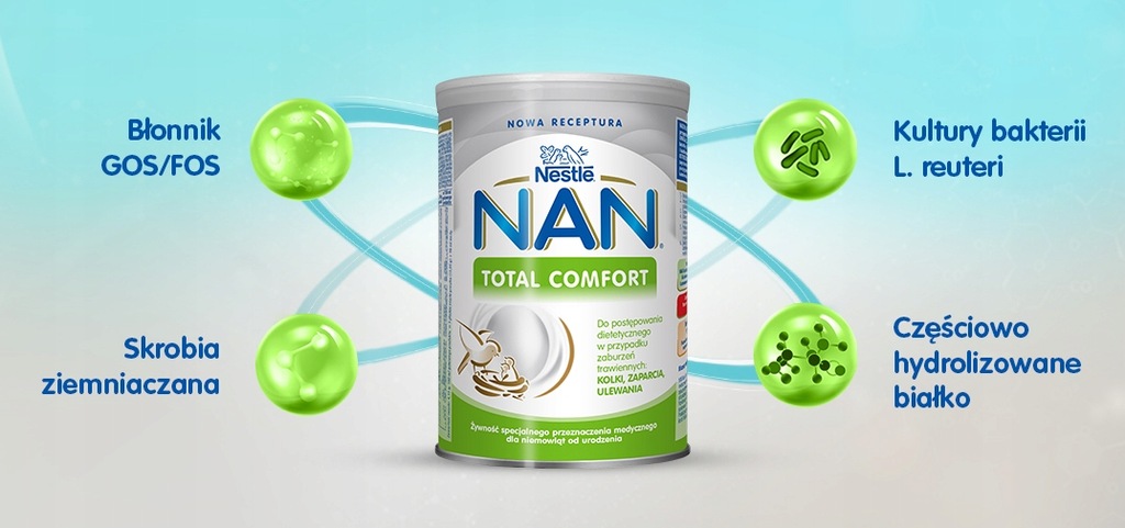 NAN Expert TOTAL COMFORT to produkt do postępowania dietetycznego w przypadku zaburzeń trawiennych: kolki, zaparcia, ulewania. Jest odpowiedni do stosowania jako jedyne źródło pożywienia dla niemowląt od urodzenia do 12. miesiąca, które z różnych przyczyn nie są karmione piersią.