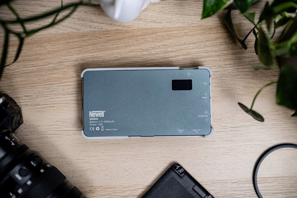 Lampa LED Newell RGB-W Rangha to "must have" w torbie każdego vlogera, filmowca lub fotografa. Duża moc zamknięta w kompaktowej obudowie sprawia, że z powodzeniem wykorzystasz ją do doświetlenia planu filmowego, a także w fotografii produktowej, ulicznej lub makro. Jej największym atutem jest pełny zakres wsparcia dla kolorów RBG oraz możliwość płynnej zmiany nasycenia, mocy oraz temperatury barwowej. Dzięki zastosowaniu wyjścia USB, wyposażone w pojemny akumulator urządzenie może też pełnić funkcję power banku.