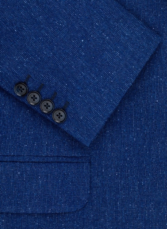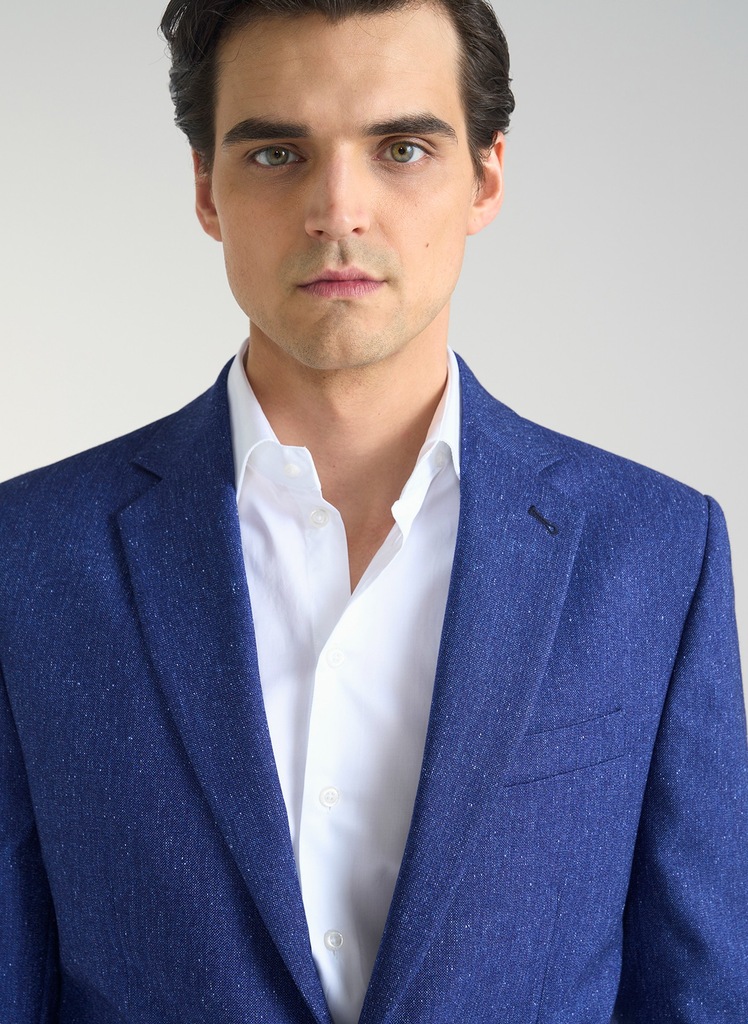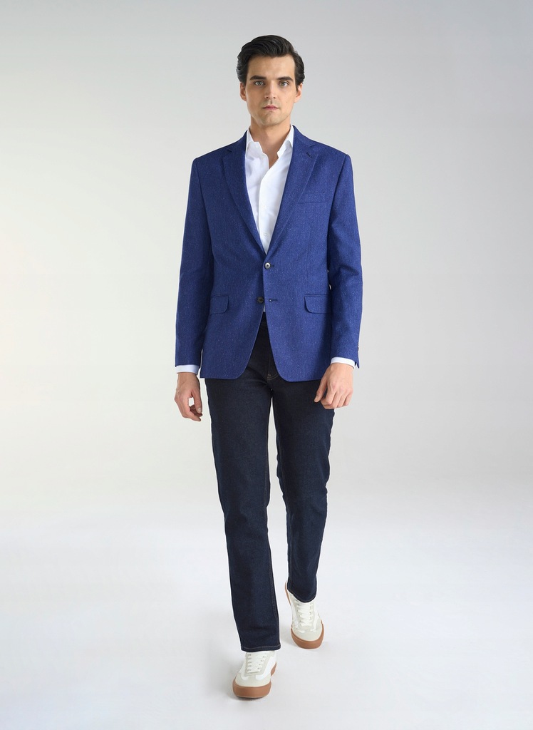 Niebieska marynarka męska z kolekcji Pako Lorente. Model zaprojektowany i uszyty w Polsce. Marynarka o melanżowym wzorze została wykonana z połączenia polisteru i wiskozy. Zaletą włókien syntetycznych jest wytrzymałość, trwałość i większa odporność na zagniecenia materiału. Model o kroju Slim Fit, który wyrównuje proporcje męskiej sylwetki, dzięki zwężeniu w talii. Efekt wydłużenia i wysmuklenia potęguje ułożenie klap w literę V. Marynarka z jednorzędowym zapięciem na dwa guziki. Mankiety rękawów zapinane na cztery, mniejsze guziki, które są sygnowane logiem marki. Z przodu marynarki dwie kieszenie z patkami, brustasza i butonierka. Wewnątrz podszewka i dwie, mniejsze kieszenie. Z tyłu dwa rozcięcia na dole, które umożliwiają swobodniejsze poruszanie się. Melanżowa marynarka będzie świetnym wyborem w stylizacjach casualowych, jak i smart casual. Do stworzenia modnej stylizacji wybierz biały, gładki t-shirt, granatowe jeansy bądź spodnie w kant i obuwie sportowe.