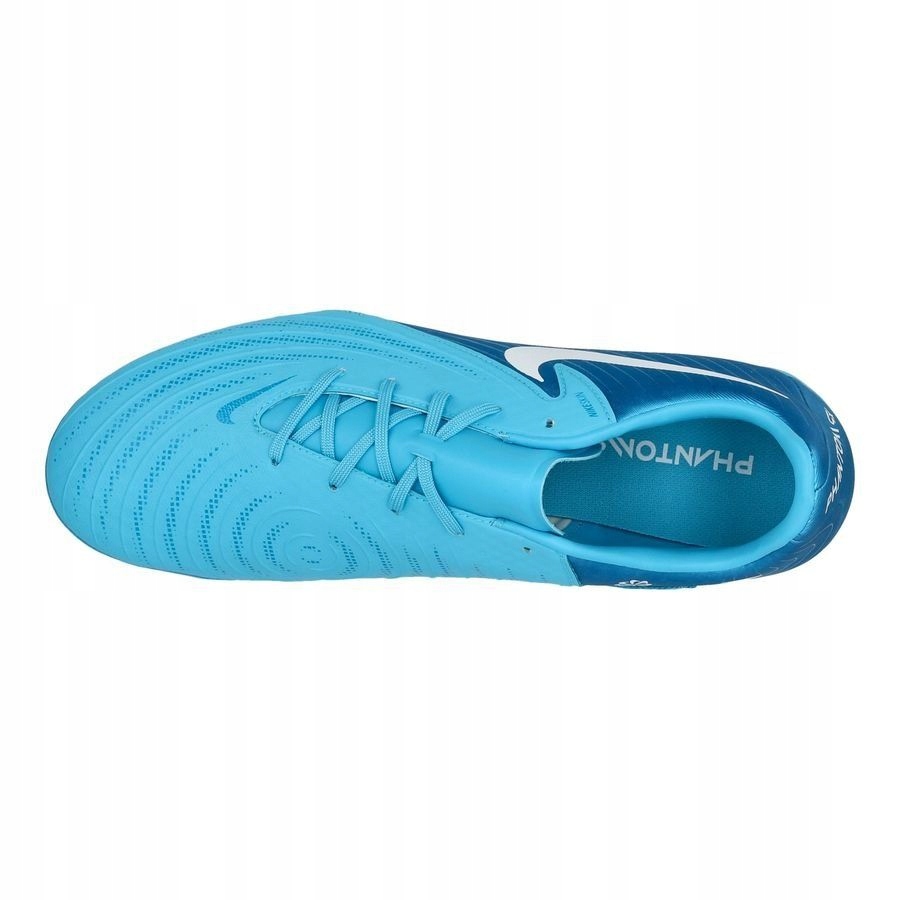Męskie buty piłkarskie Nike Phantom wyróżniają się nowatorskimi technologiami, które zapewniają niezwykłą precyzję na boisku. Nowa odsłona linii Phantom zyskała niebieską sylwetkę butów z wyrazistymi detalami, co tworzy niezwykle ciekawy koncept. Treningowe korki Nike zostały zaprojektowane do gry na naturalnej murawie i sztucznej nawierzchni gdzie nie ma miejsca na błędy pod względem kontroli nad piłką. Syntetyczna, miękka cholewka wygodnie dopasowuje się do stopy, a wykończenie w postaci czepliwej tekstury, zapewnia opanowane przyjęcie piłki, skuteczny drybling i celne strzały. Asymetryczne sznurowanie dba o dopasowanie konstrukcji do stopy i jednocześnie zwiększa powierzchnię kontaktu z piłką, co z kolei przekłada się na większą moc uderzeń. Podeszwa to połączenie elastycznej konstrukcji z lekką, niepełną płytką i specjalną konfiguracją kołków. Takie rozwiązanie gwarantuje dynamiczną przyczepność podczas szybkich zmian kierunku.